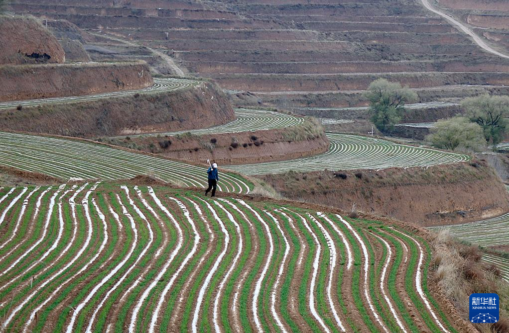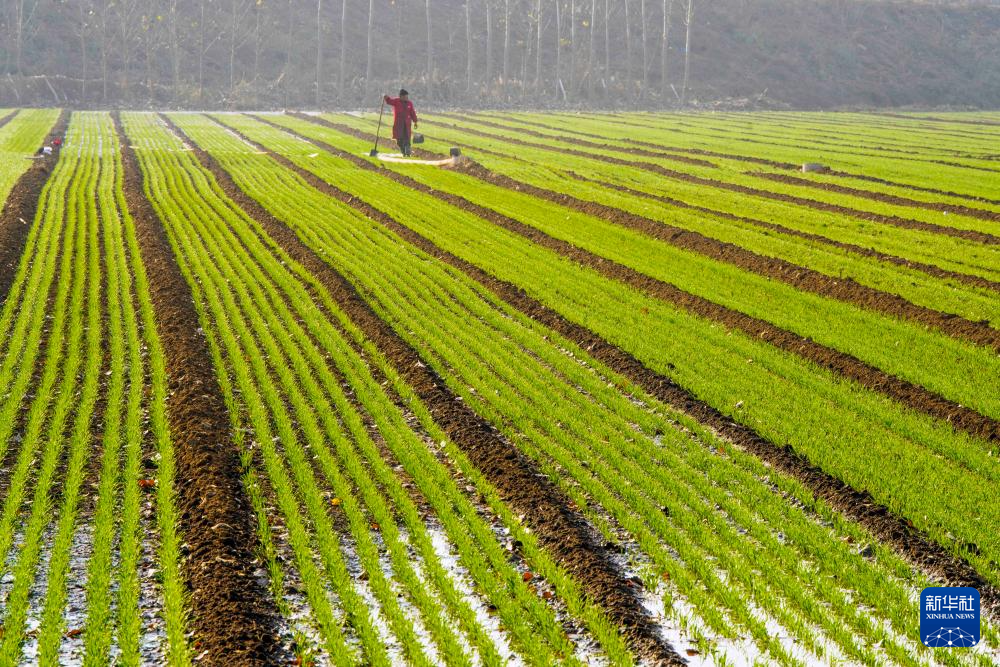 11月10日,在甘肃省平凉市静宁县三合乡前咀村,农民在覆膜后的冬小麦田里劳作。新华社发(王毅摄)