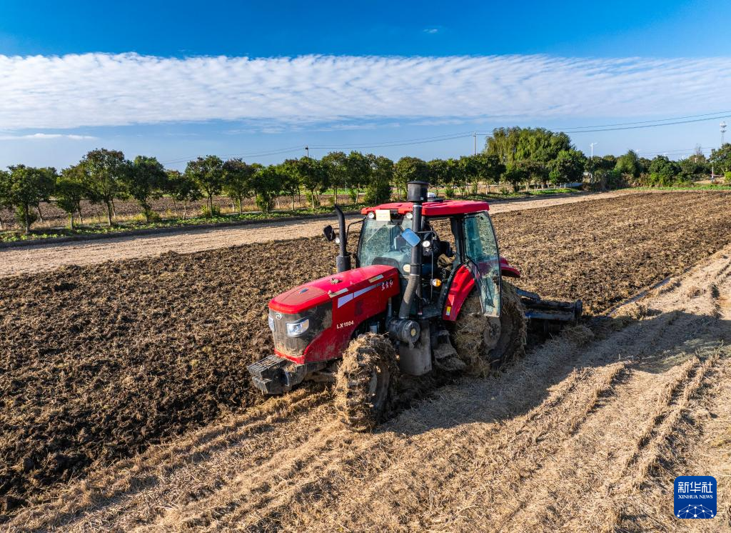 11月11日,江苏省兴化市陈堡镇宁乡村农民驾驶农机耕地,为冬小麦播种做准备(无人机照片)。新华社发(周社根 摄)