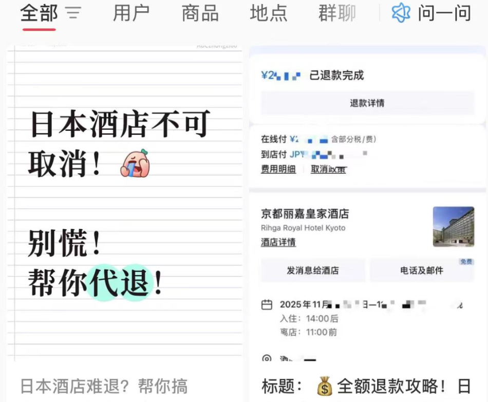 旅客北北(化名)原定11月20日至24日前往日本京都旅行,在家人出于安全考虑的劝阻下,她最终决定取消行程。她告诉记者,其预订的1575元往返机票实现了“丝滑退款”,未产生手续费;甚至连预订时标注“不可取消”的酒店订单,也在16日获得了全额退款。