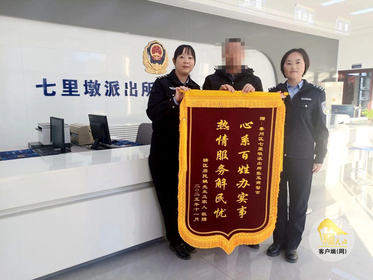 新天水讯【天水融媒记者 蔚军平】近日,姚先生来到秦州公安分局七里墩派出所警务服务大厅,将一面写有“心系百姓办实事、热情服务解民忧”的锦旗递到了户籍室民警手中,对户籍民警热情高效、贴心周到的服务表示由衷感谢。