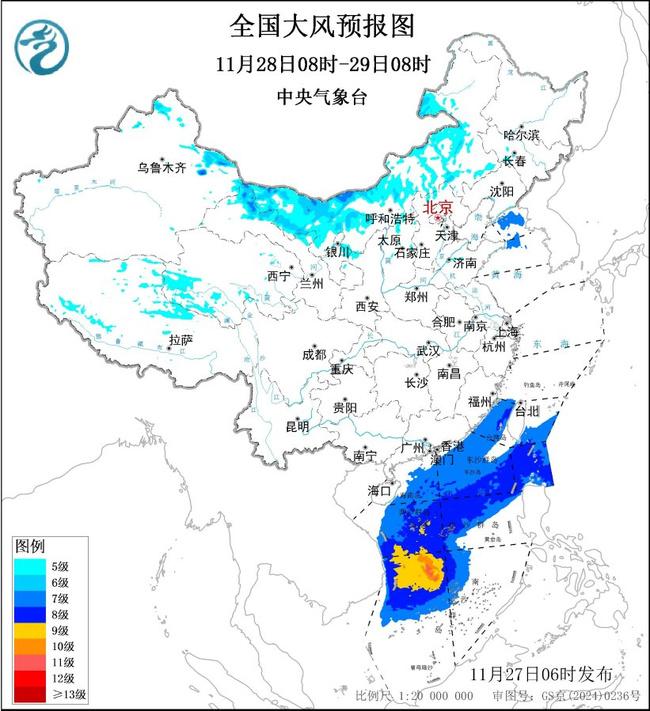 11月28日08时至29日08时,新疆北部和东部、内蒙古大部、甘肃北部、宁夏北部、山西北部以及青海南部、西藏北部等地有5~6级大风,阵风7~8级,其中新疆东部山口地区、内蒙古中西部部分地区风力可达7级,阵风8~9级;11月28日08时至29日08时巴士海峡、南海东北部和中部海域将有8级、阵风9级的东北风,其中南海西南部海域的风力可达9级、阵风10级。