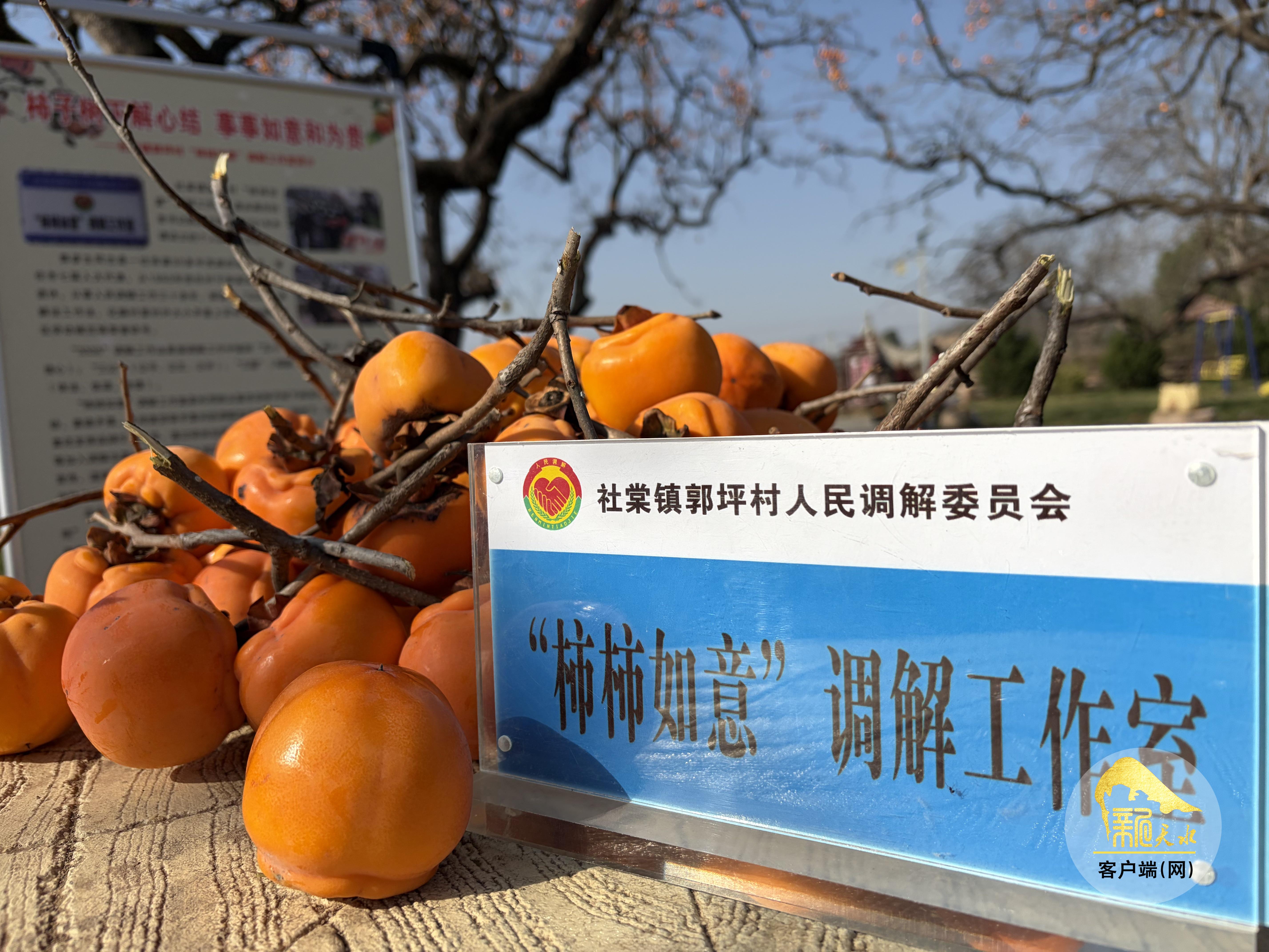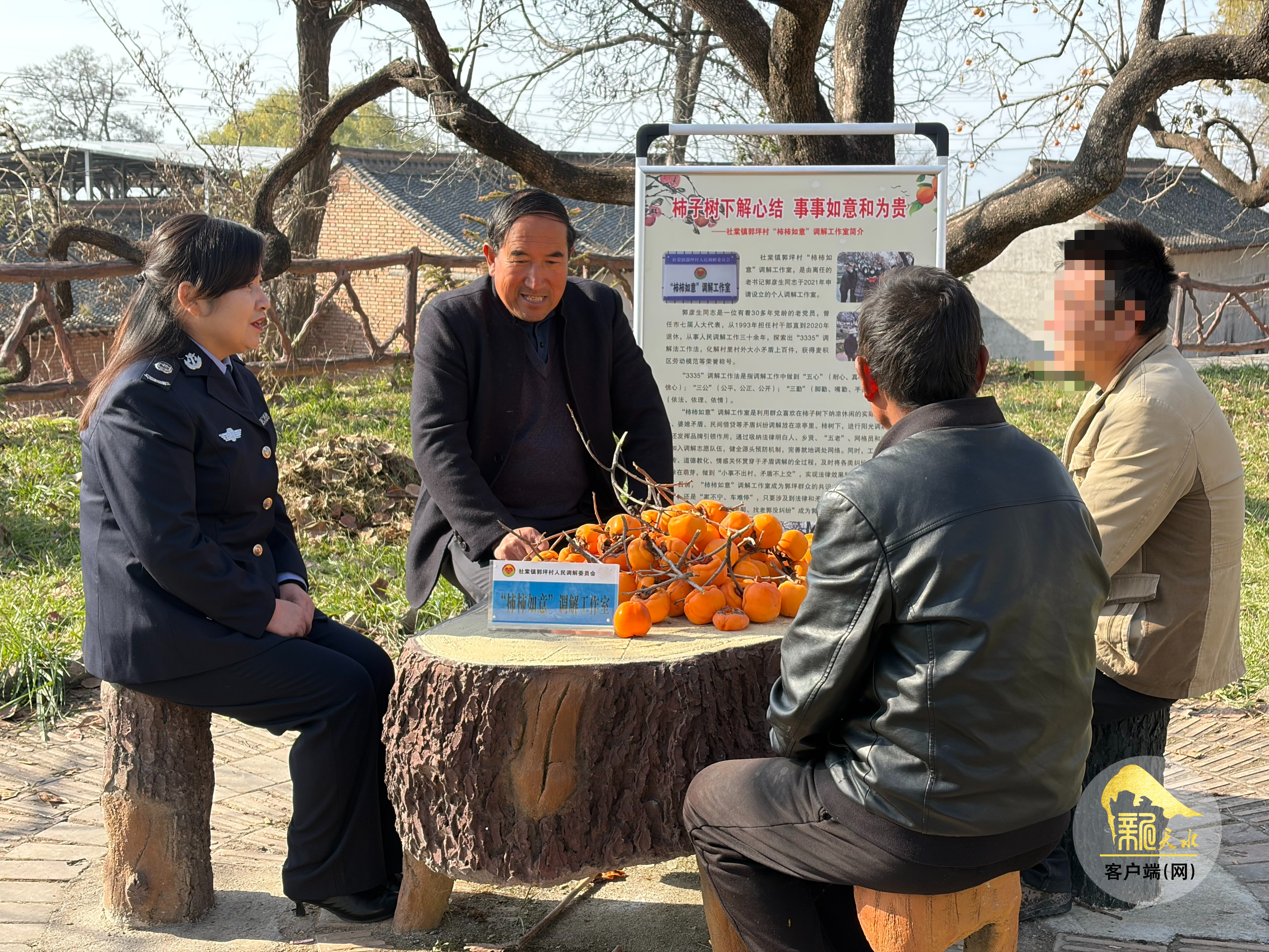 这温馨的一幕,是“柿柿如意”调解工作室的日常。自2021年成立以来,工作室充分利用当地群众喜欢在柿子树下议事休闲的习惯,将调解桌搬到凉亭下、柿树旁,用阳光下以“情”为媒的沟通,化解了众多邻里、家庭和债务纠纷。