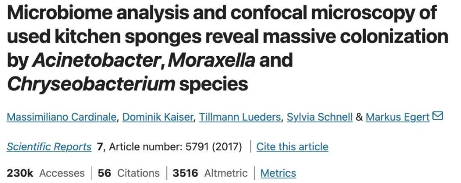 2017年,发表在《自然》杂志上的一项研究显示,一块长期使用的洗碗海绵上,每立方厘米的细菌数高达540亿个,整块海绵的细菌种类可以高达362种。