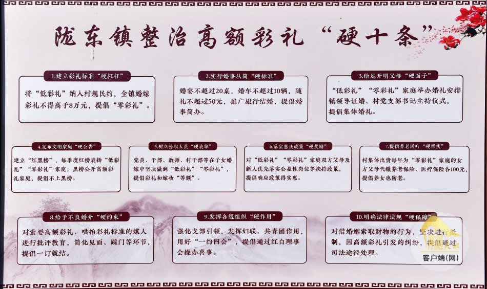 长期以来,陇东镇深受传统婚俗观念影响——婚嫁彩礼普遍高达12至15万元,婚宴规模动辄三四十桌,“娶了媳妇,穷了全家”的困境让许多家庭不堪重负。面对这一沉疴顽疾,“硬十条+红黑榜”机制逐步在基层落地生根。