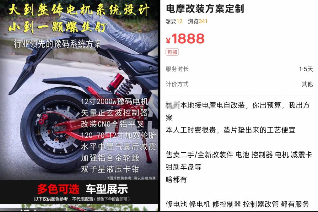 网购平台上电摩改装服务和配件的商品信息截图(拼图)