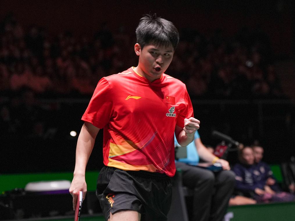 12月3日,中国队选手林诗栋在男单比赛中庆祝得分。新华社记者 王曦 摄