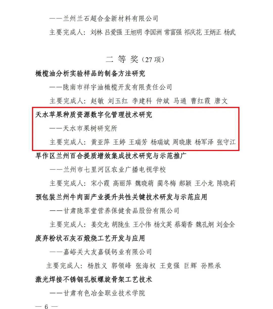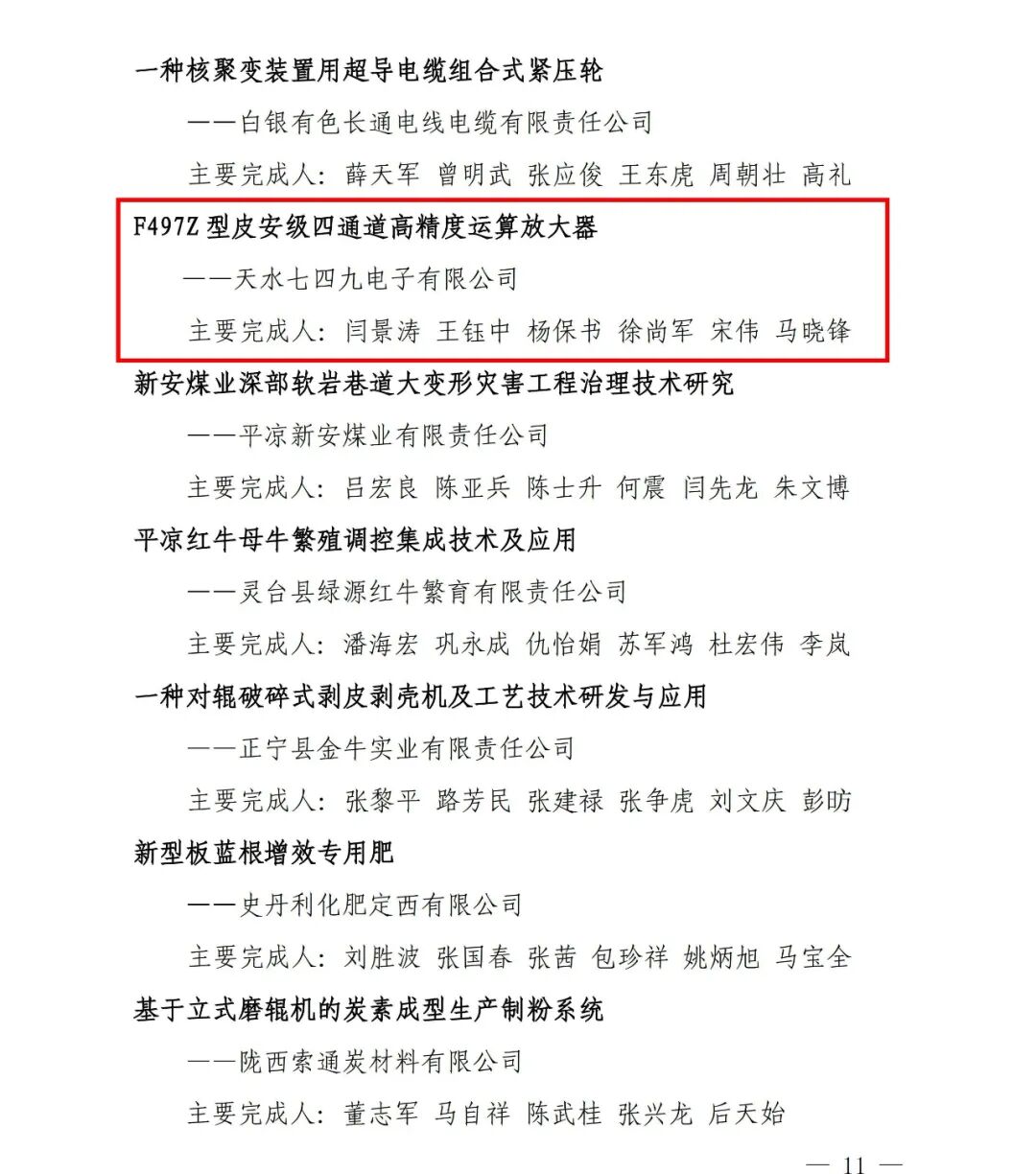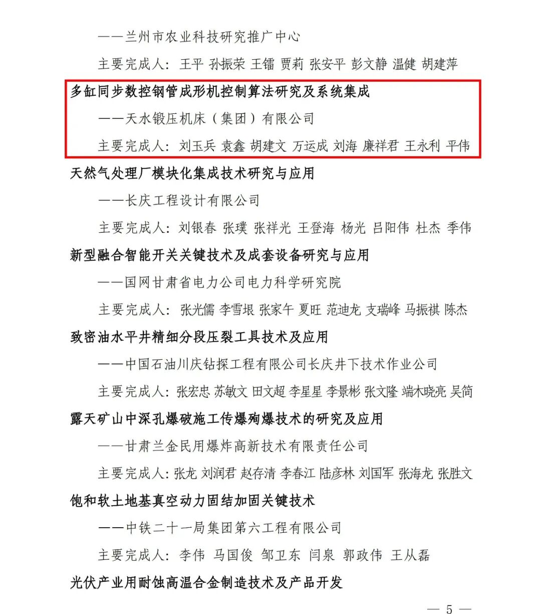 其中,天水锻压机床(集团)有限公司的《多缸同步数控钢管成形机控制算法研究及系统集成》创新成果获得一等奖;天水市果树研究所的《天水苹果种质资源数字化管理技术研究》创新成果获得二等奖;天水七四九电子有限公司的《F497Z型皮安级四通道高精度运算放大器》创新成果获得三等奖。