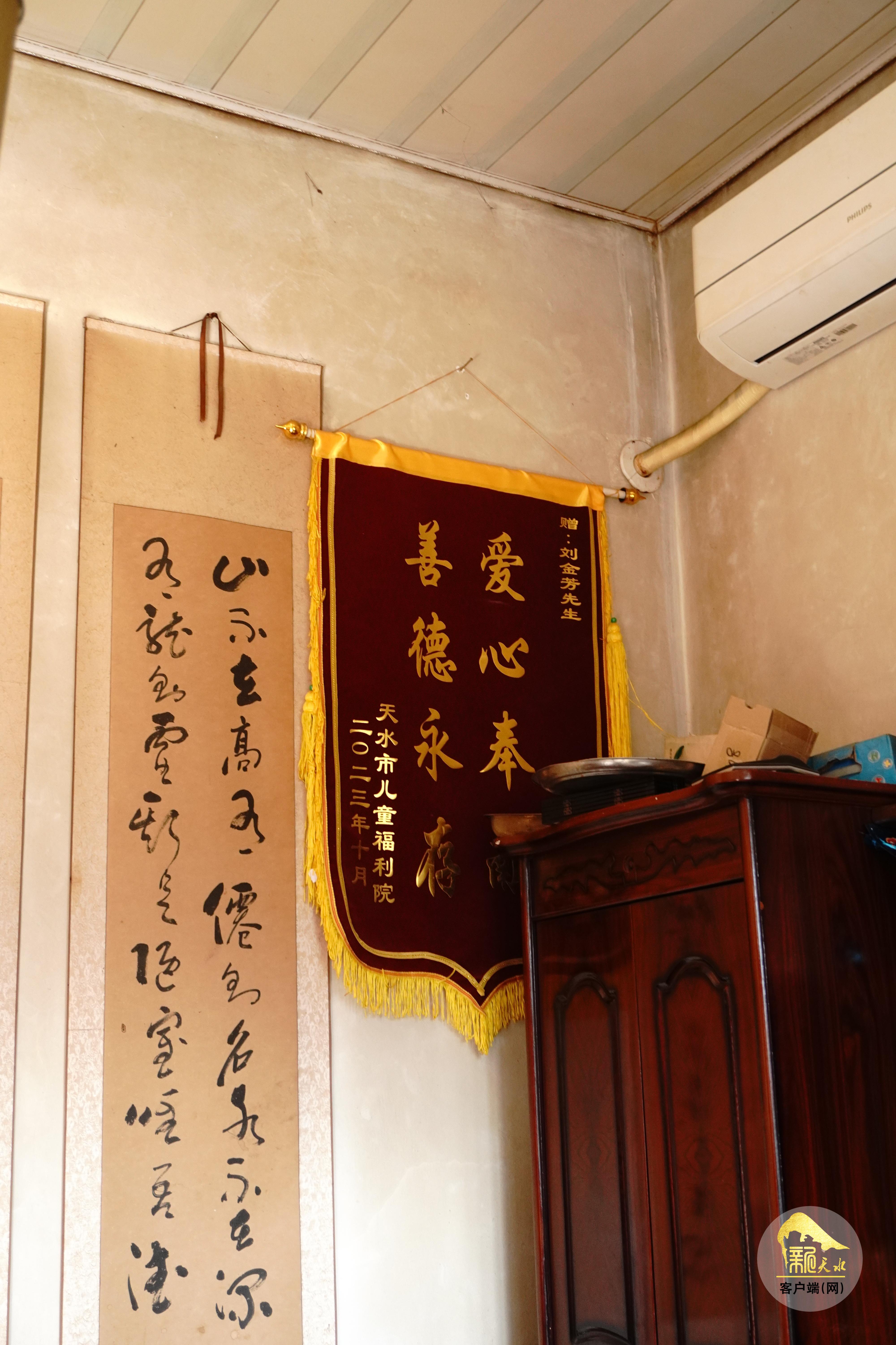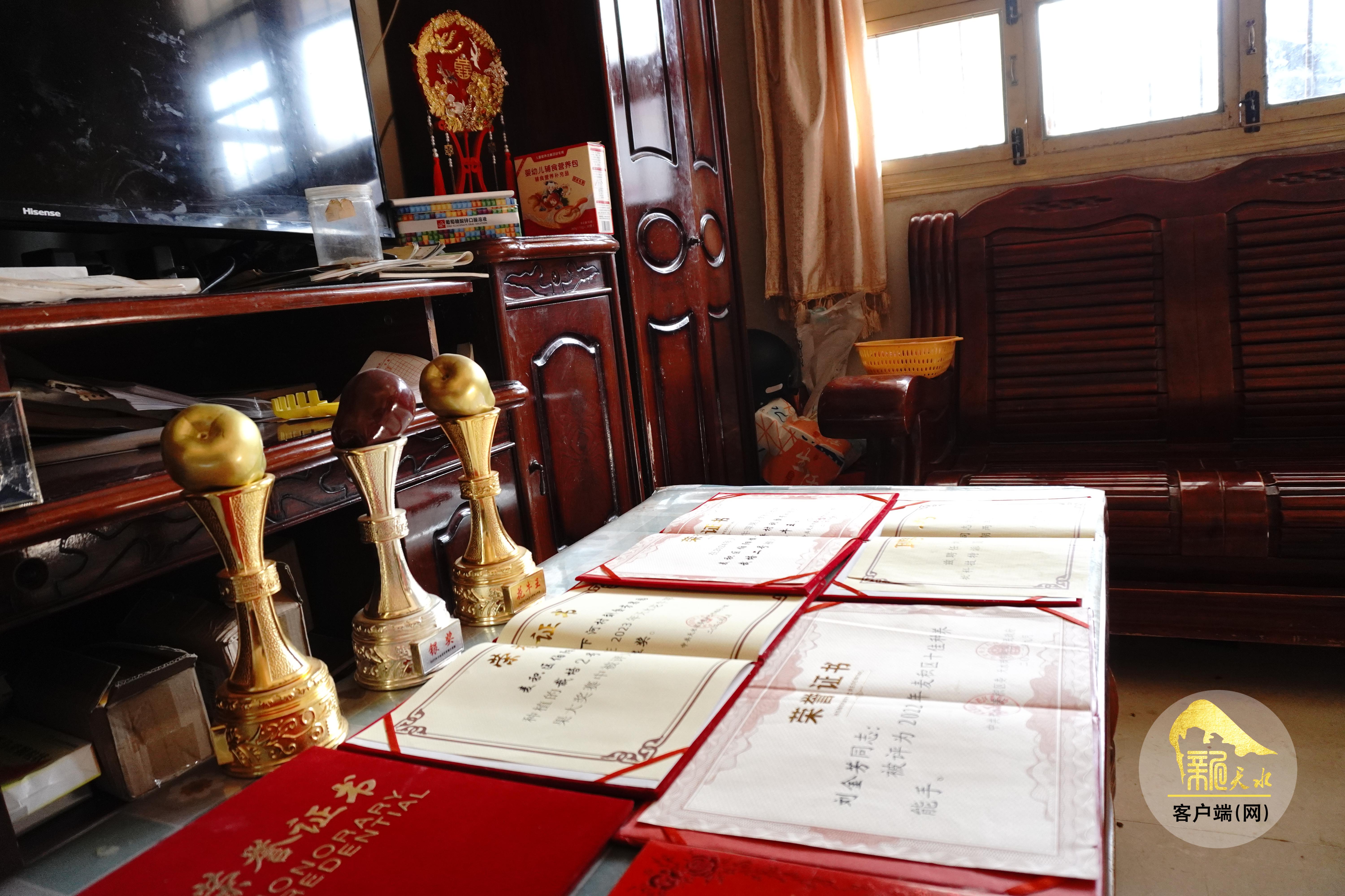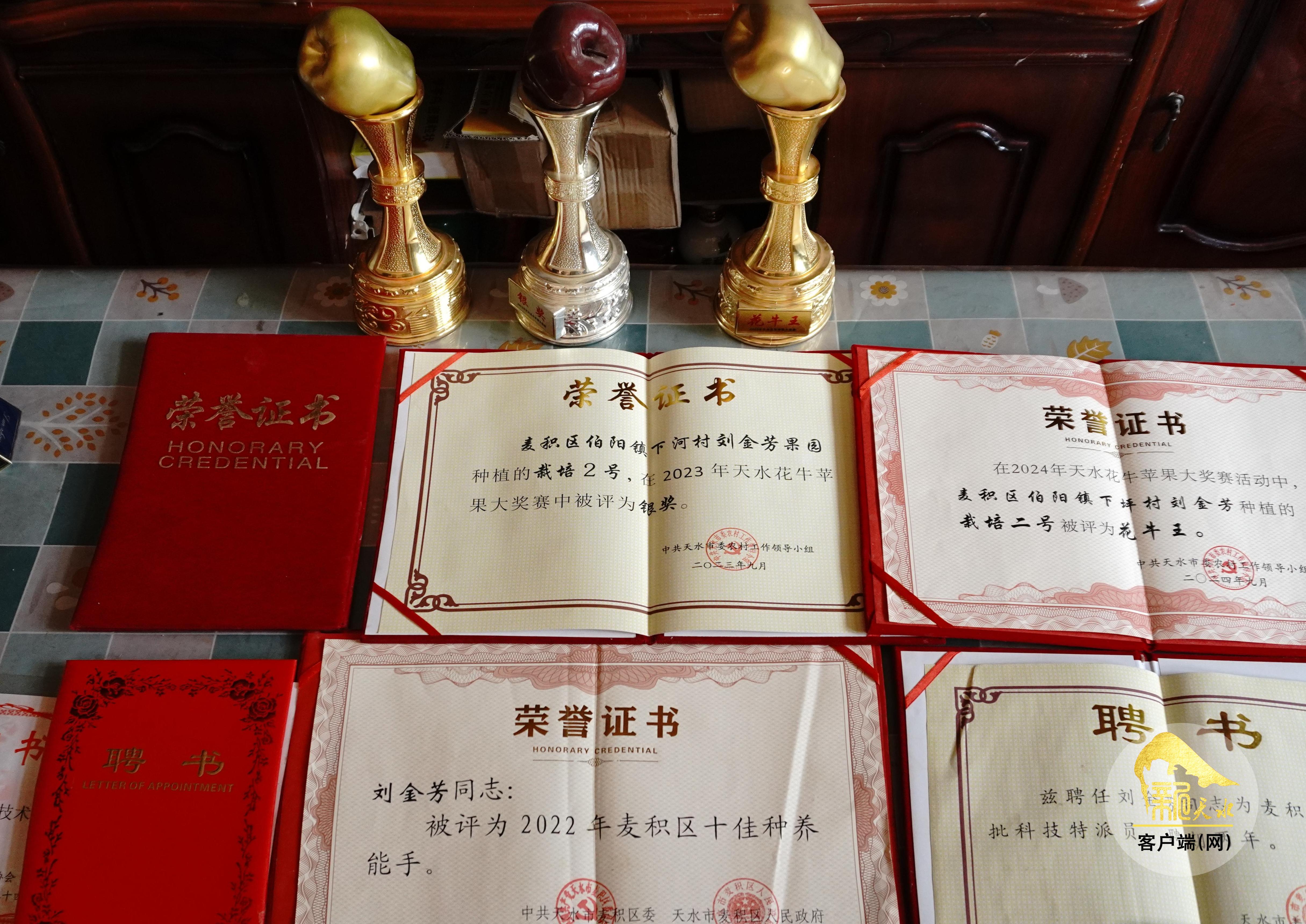 刘金芳家里的墙上有一面天水市儿童福利院赠送的锦旗,上面写着“爱心奉献 善德永存”八个大字。说起这面锦旗,刘金芳讲述了它的来历。2022年村干部通知他参加天水市农业农村局组织的“花牛王”评选活动,当时他心里有些忐忑,村上有些种植户比他经营果树更早,有些年轻人比他更有知识和技术,自己的果子有那么好吗?不过村干部的劝说打消了他的疑虑。那一年的“花牛王”评选,果树专家们通过单果重量、着色度、果型指数、可溶性固形物等指标检测,他选送的“栽培二号”获得了银奖。