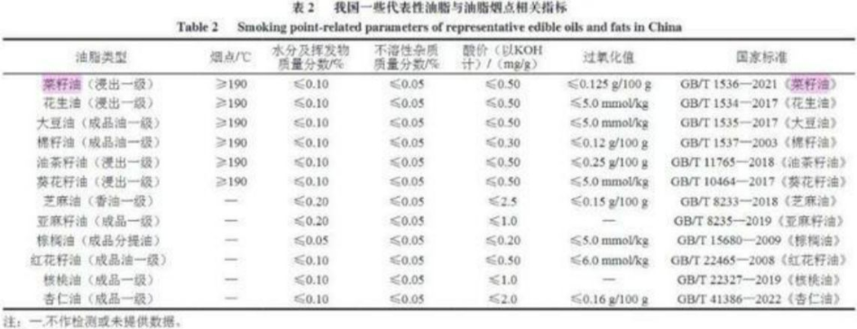菜籽油烟点范围通常为151~218.5℃,[6]在我国现行食用油国家标准中,菜籽油、花生油、大豆油等食用油脂一级油的烟点均统一确定为“≥190℃”。菜籽油能够轻松胜任煎、炸、爆炒等各种高温烹饪方式,是名副其实的适合中国厨房的油。