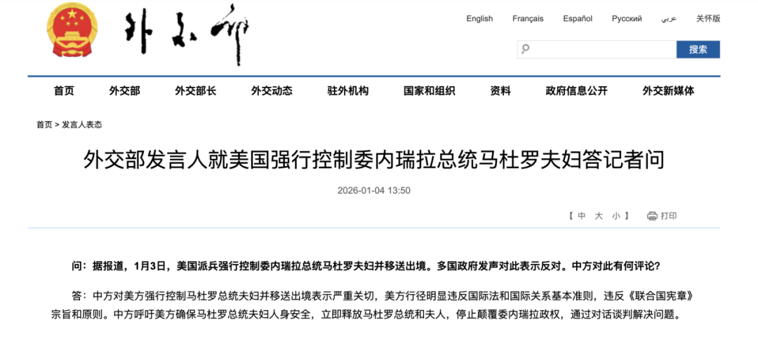 外交部:中方呼吁立即释放马杜罗总统和夫人