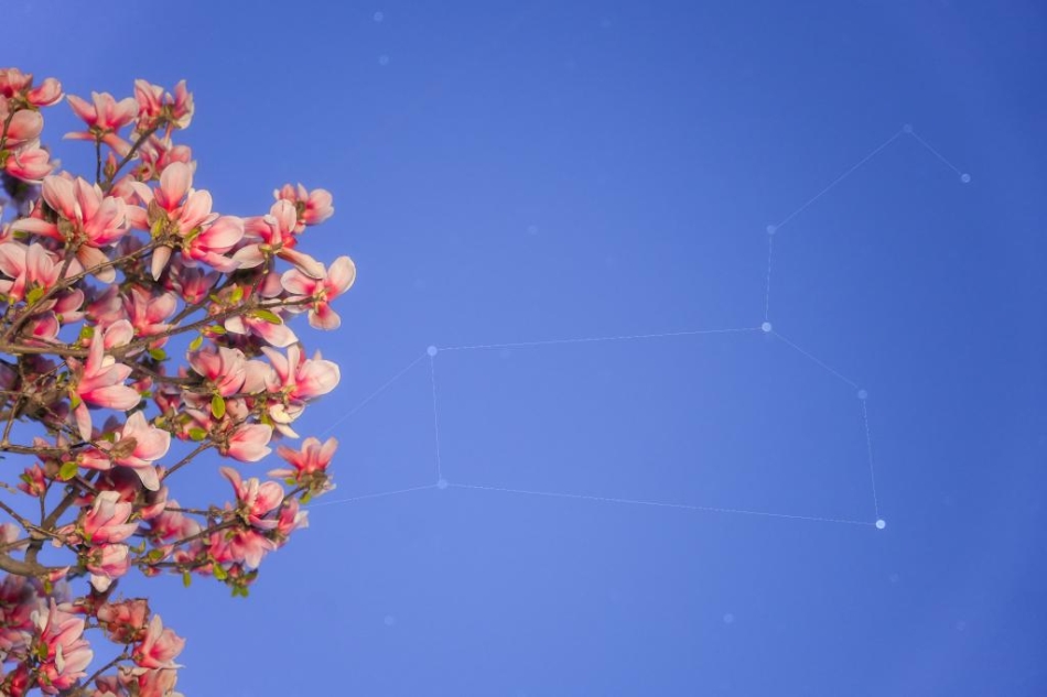 2025年3月27日,在北京丰台拍摄的玉兰花与狮子座“同框”。(王俊峰 摄)