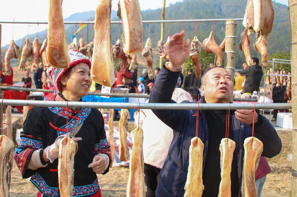 在江西吉安市青原区东固畲族乡敖上村,村民家里的窗台、院落成了腊味“展示场”,一串串油光发亮的腊肉、腊鱼挂在房前,软糯糯的红薯干躺在簸箕里,正等着阳光和时间把它们酿成美味。