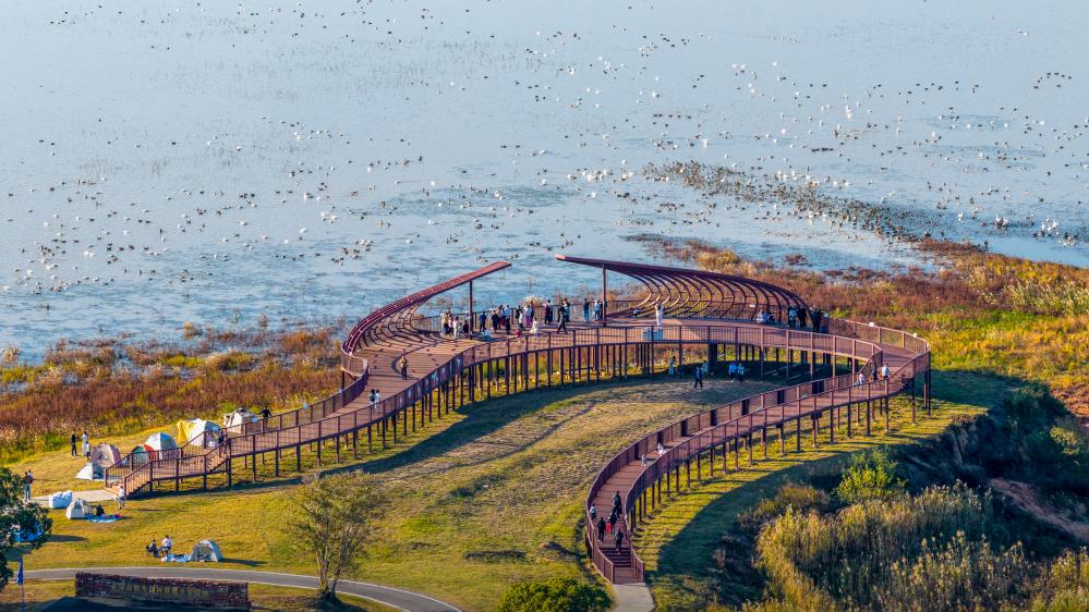 “鄱湖鸟,知多少?飞时遮尽云和月,落时不见湖边草。”此时,鄱阳湖正迎来越冬候鸟迁徙高峰。在江西九江永修县吴城镇,清风拂过,湖面微漾,一阵阵壮观的“鸟浪”,让观景台上的游客们连连惊呼。