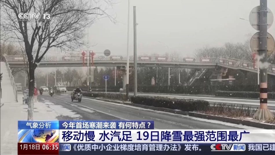 寒潮移动相对比较慢,在渗透南下的过程当中有水汽配合。昨天(17 日)华北地区陆续降雪,今天(18 日)河南山东降雪增强,19日降雪范围最广也会最强。陕西南部、山西南部、河南、湖北北部、安徽、江苏的北部等地会有大雪甚至暴雪天气。