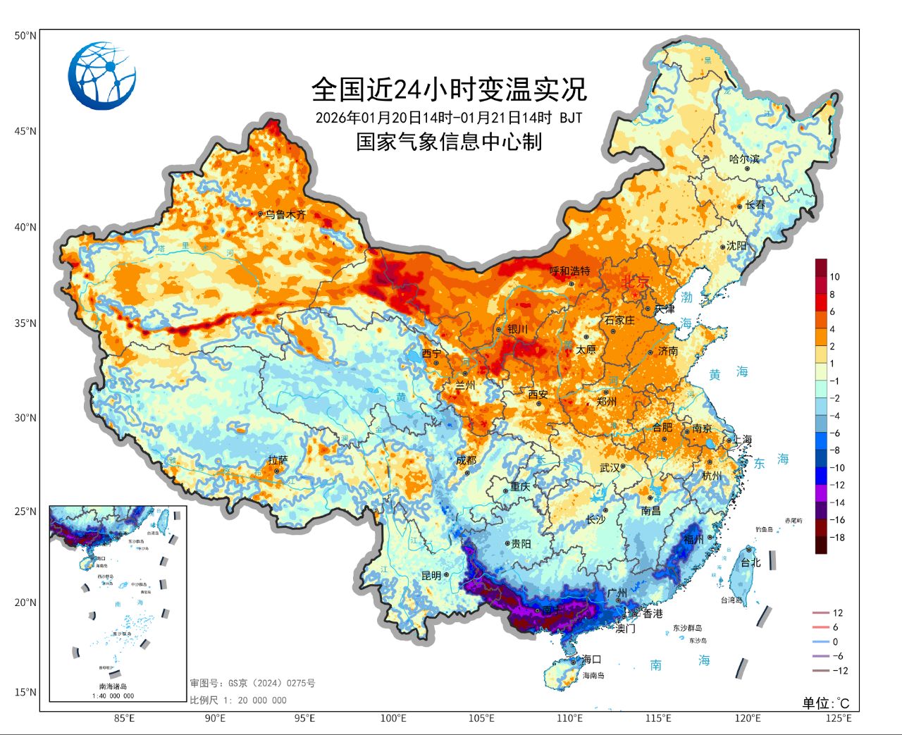 今天,长江以北地区的寒意稍有减弱,多地气温有所回升。而长江中下游地区寒意明显,广西南部和云南东南部在寒潮的影响下也出现剧烈降温,部分地区降温达15℃以上。