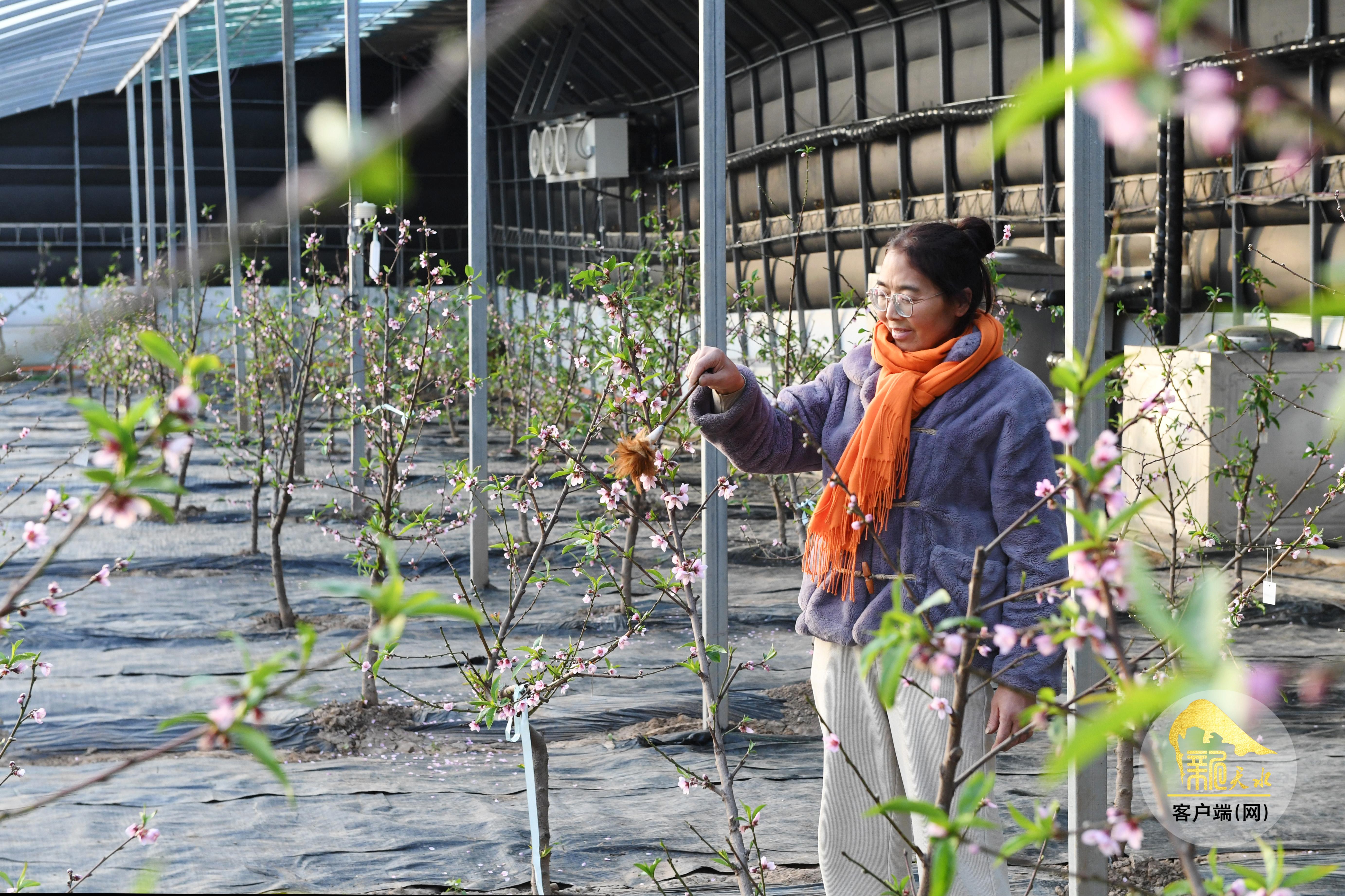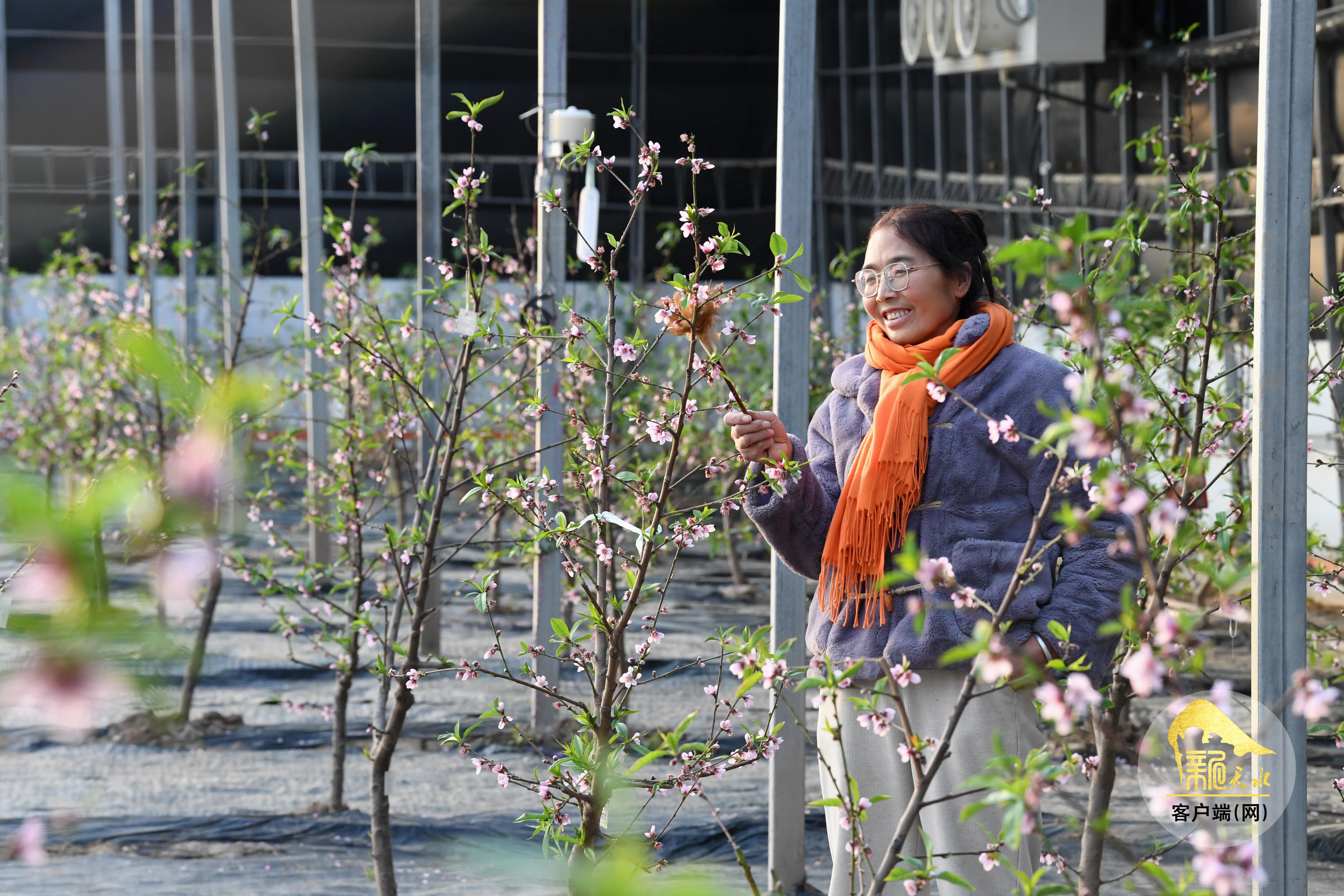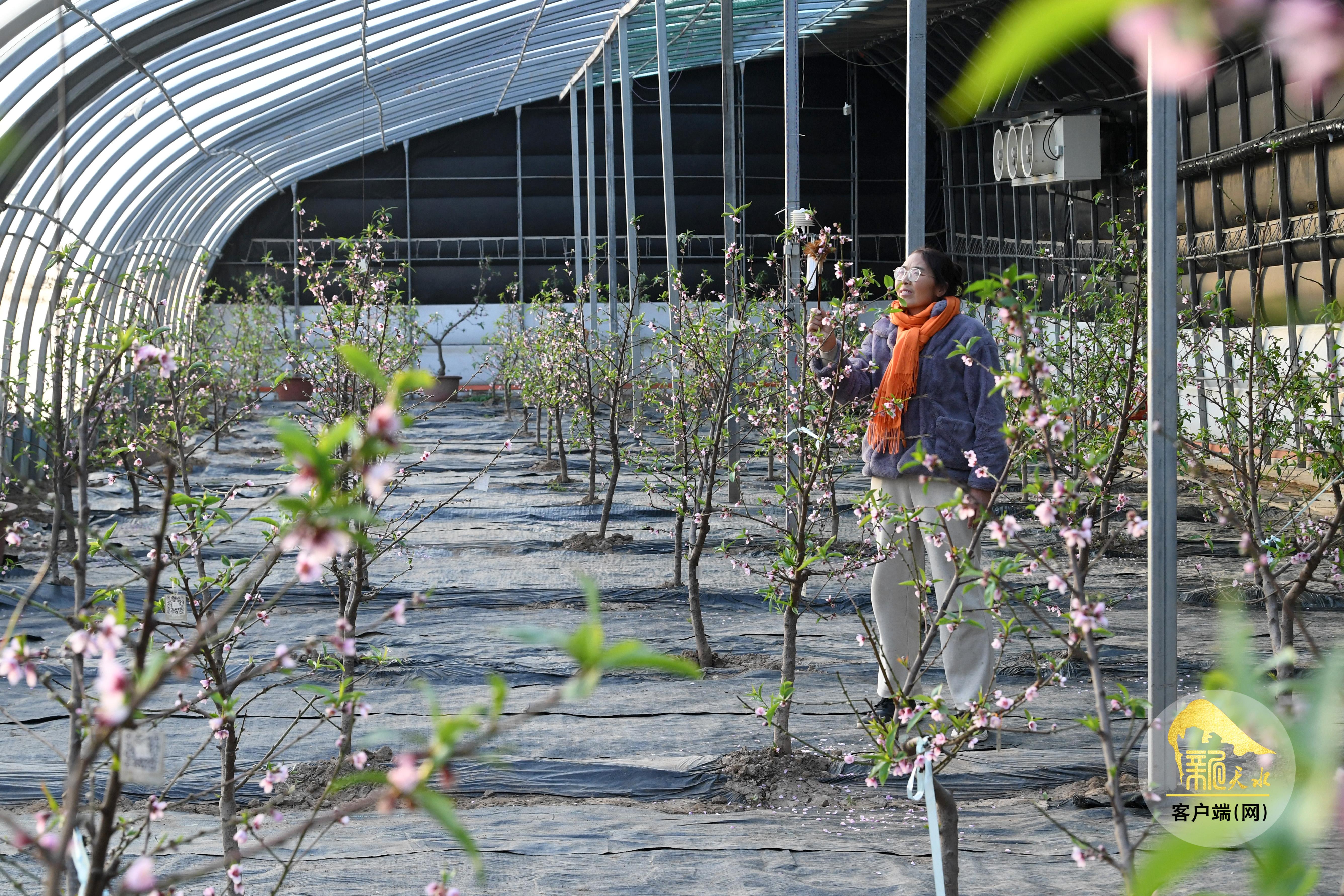1月21日,秦安蜜桃智慧农场的日光温室大棚内桃花缀满枝头,工人正在进行人工授粉。