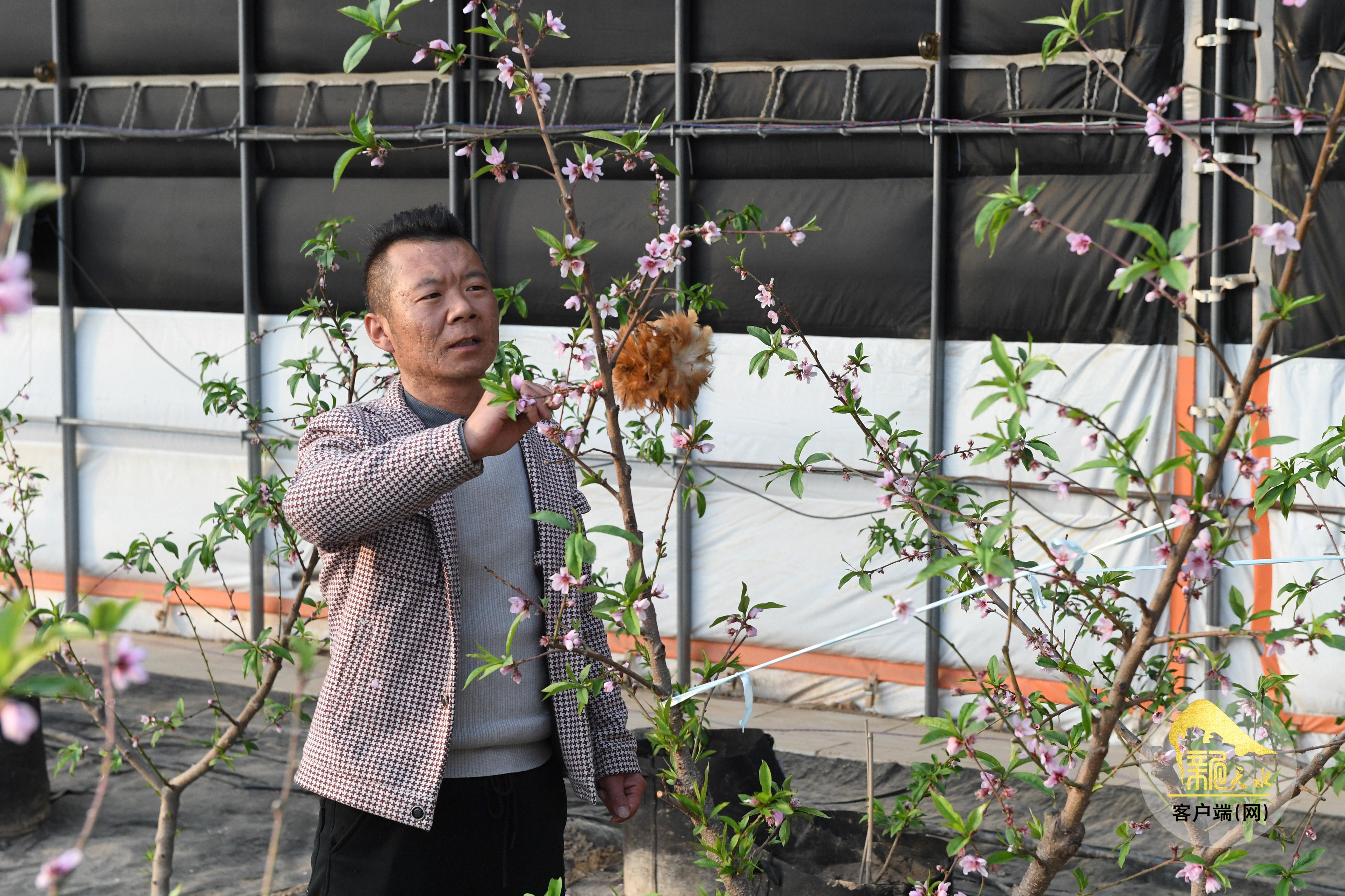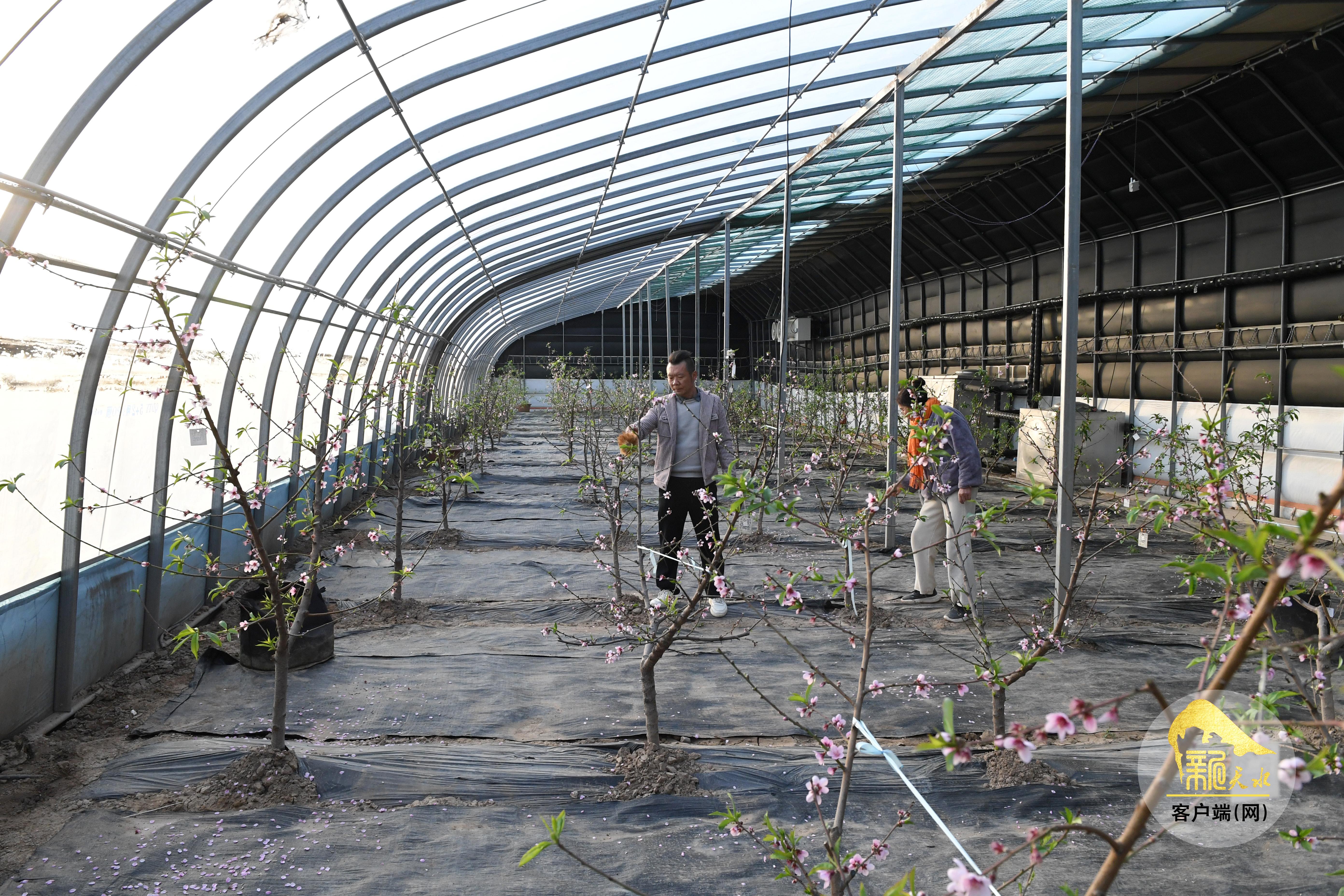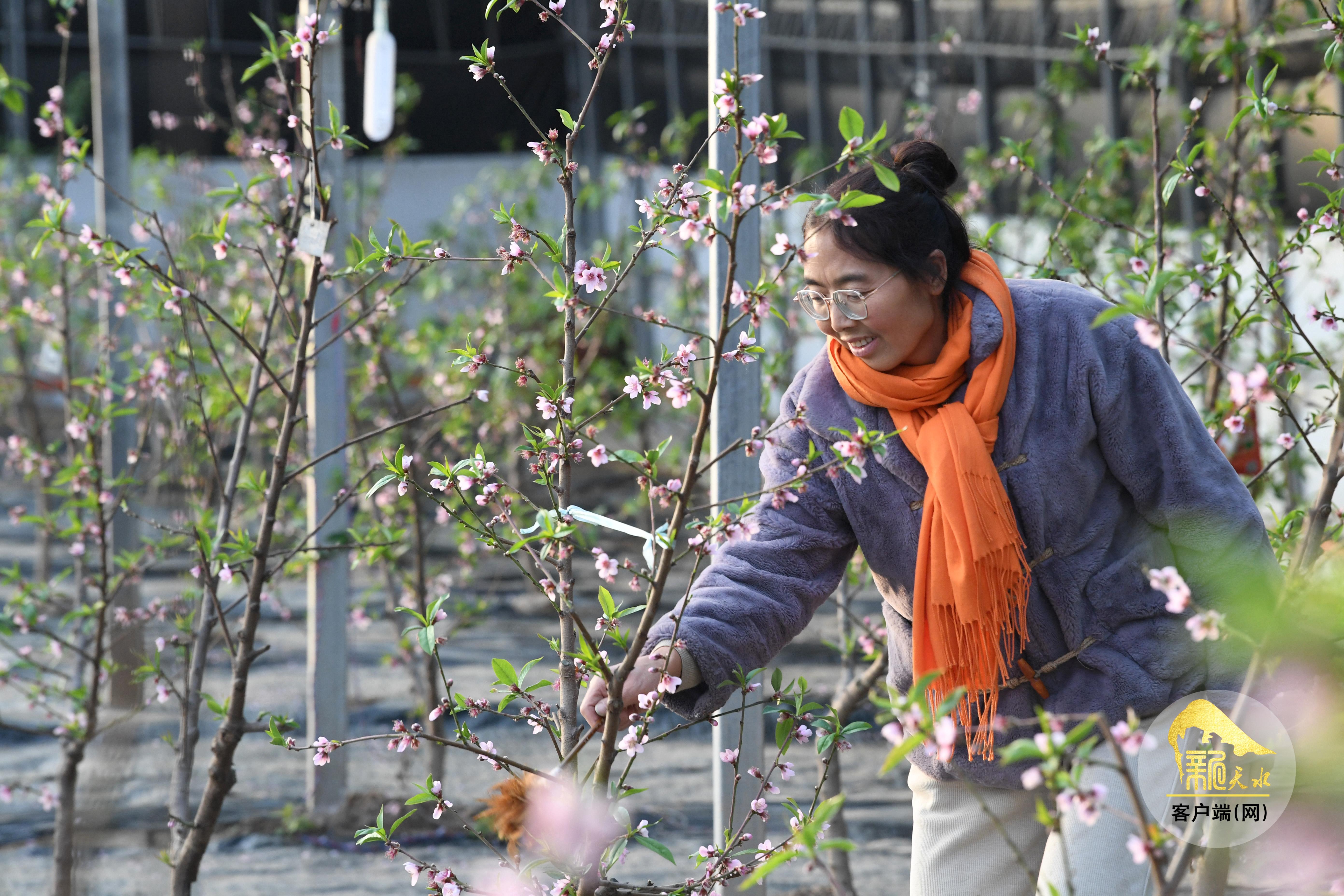 1月21日,秦安蜜桃智慧农场的日光温室大棚内桃花缀满枝头,工人正在进行人工授粉。