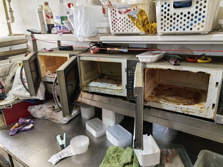 随后,记者又与执法人员来到一家“小碗菜”外卖门店。灶台黢黑一片,地板粘脚且散落着多个烟头,三台微波炉内沾满了黄色黏液,电饭煲正加热一锅“红烧排骨”料包。而这家店却在外卖平台上宣称“大厨现炒 拒绝预制菜 新鲜食材”。所谓的“现炒”就是“微波炉加热”,有顾客在其外卖平台店铺上点评,“打包盒是热的,菜是凉的,一看就知道是微波炉加热”。记者到此只片刻工夫,便有十几位骑手来此取餐。截至该店被检查时,其外卖平台页面显示“月售900+”。