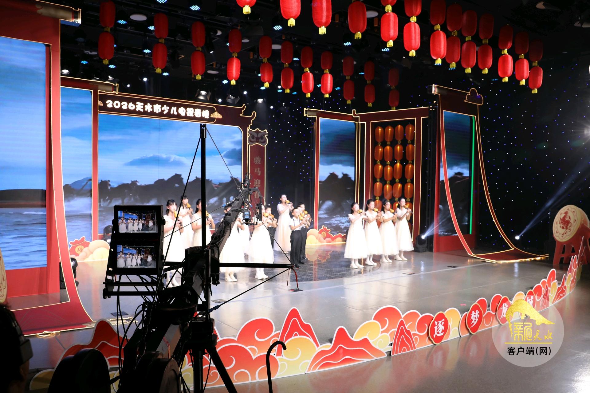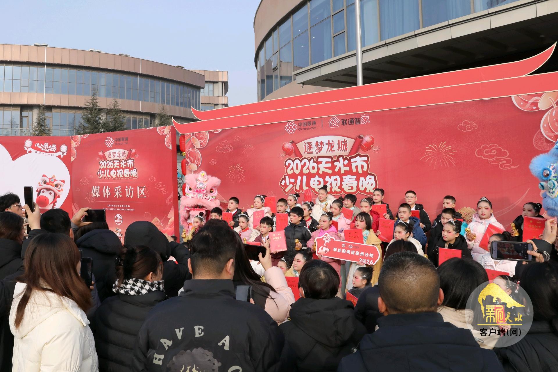 1月23日,天水市融媒体中心演播大厅内灯光璀璨,气氛热烈,2026天水市少儿电视春晚在这里正式开机录制。来自天水市两区五县及陇东南地区的上千名少年儿童陆续登台,以真挚的表演,迎接即将到来的新春。