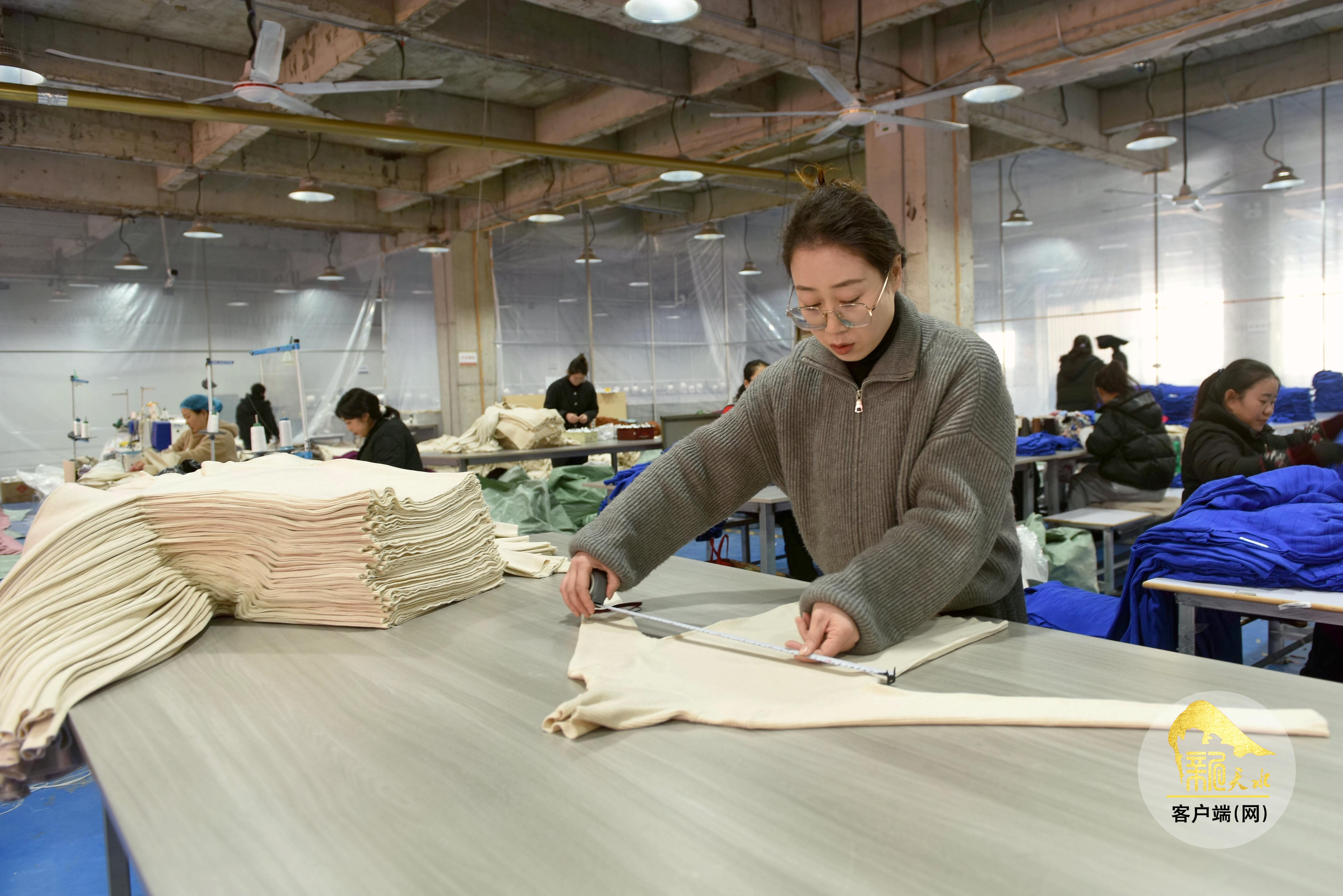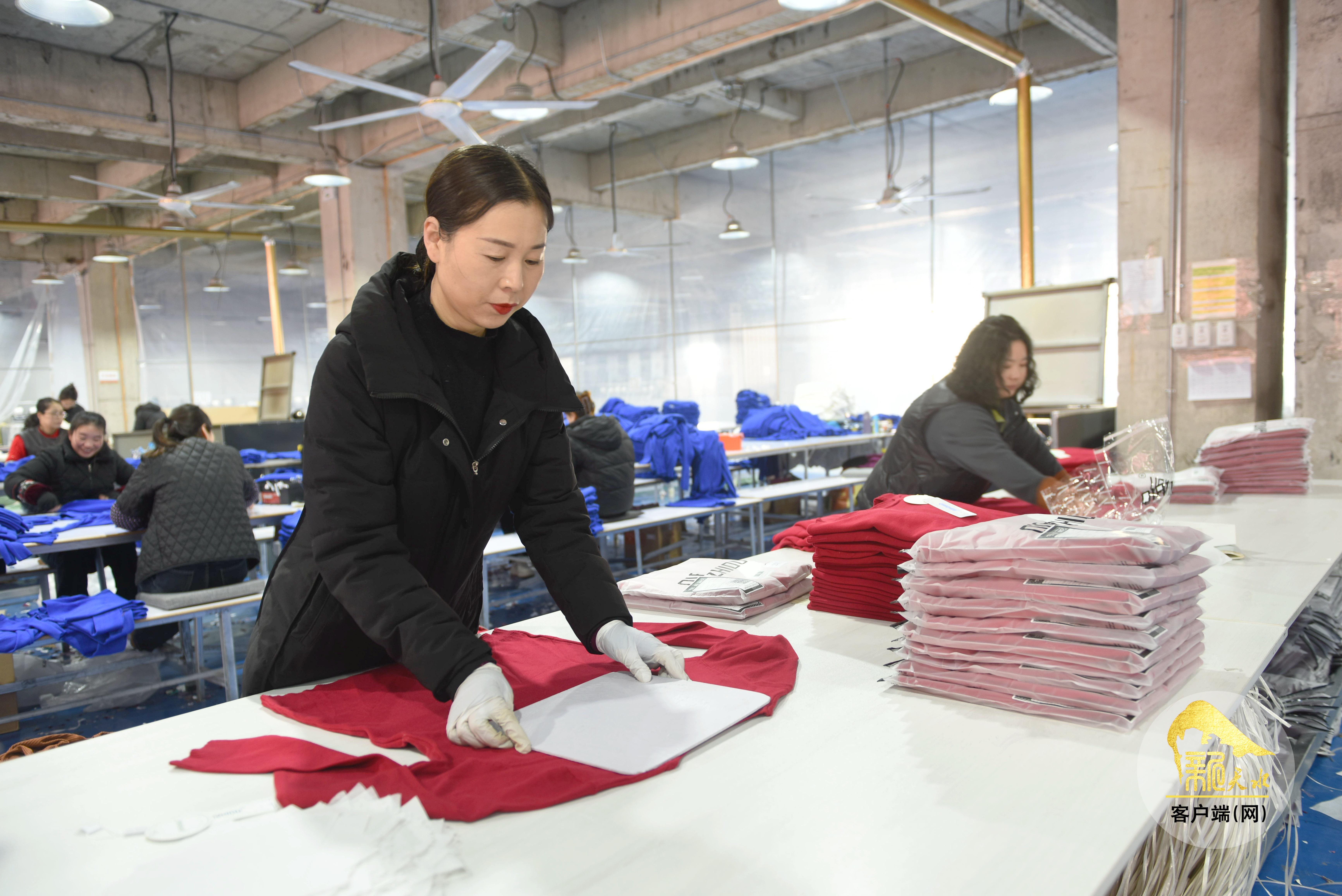 1月24日,在天水千之都服饰有限公司乡村就业工厂内,工人正在生产线上进行裁剪、锁边、熨烫、包装等工作。