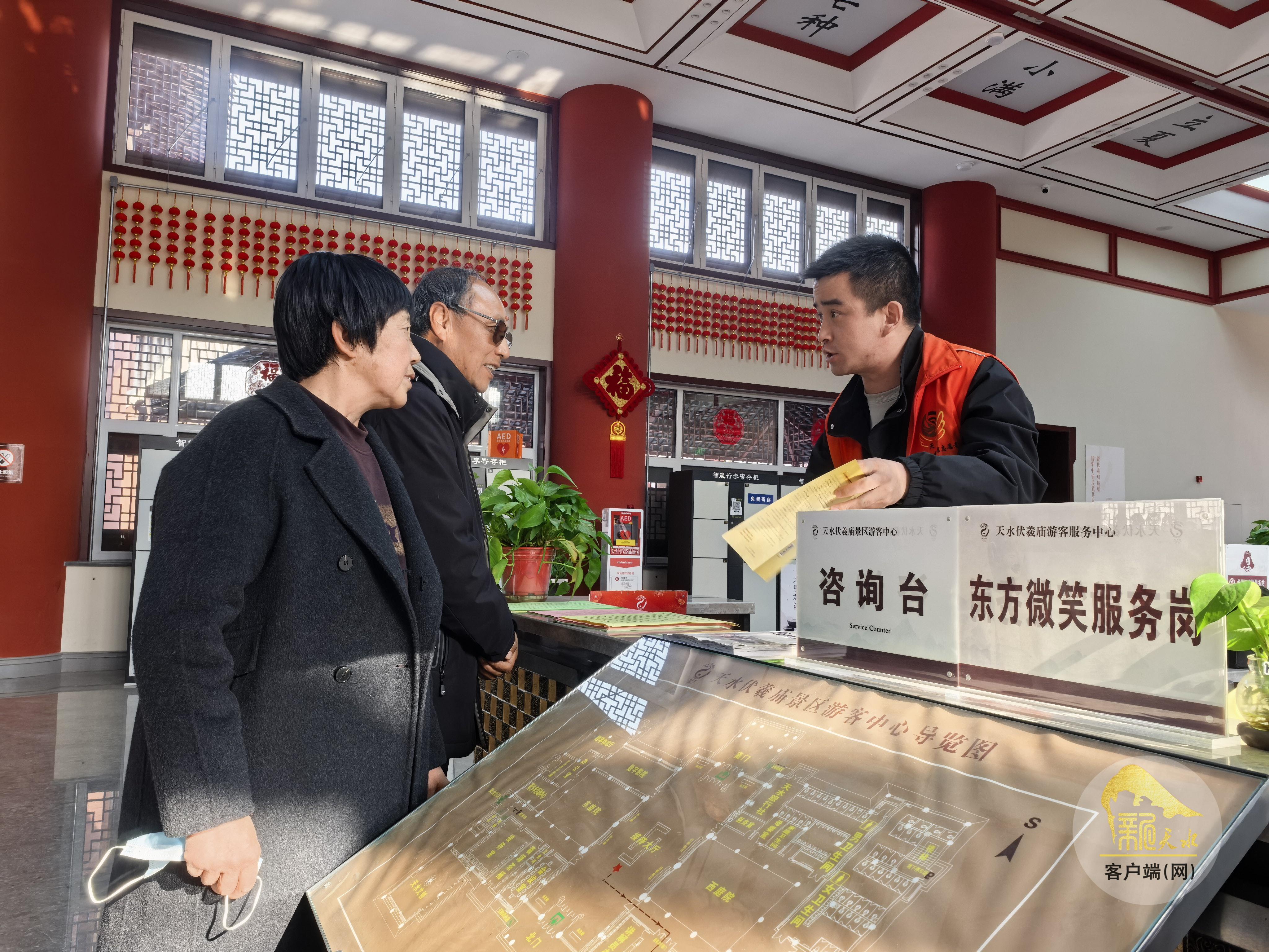 “景区特别设置了‘东方微笑’服务岗,工作人员以饱满热情和规范礼仪接待每一位游客。”天水市博物馆社会服务部副主任李瑛介绍,景区将细致入微的关怀融入每一个服务细节,全力打造有情怀、有温度的伏羲文化旅游优质名片。