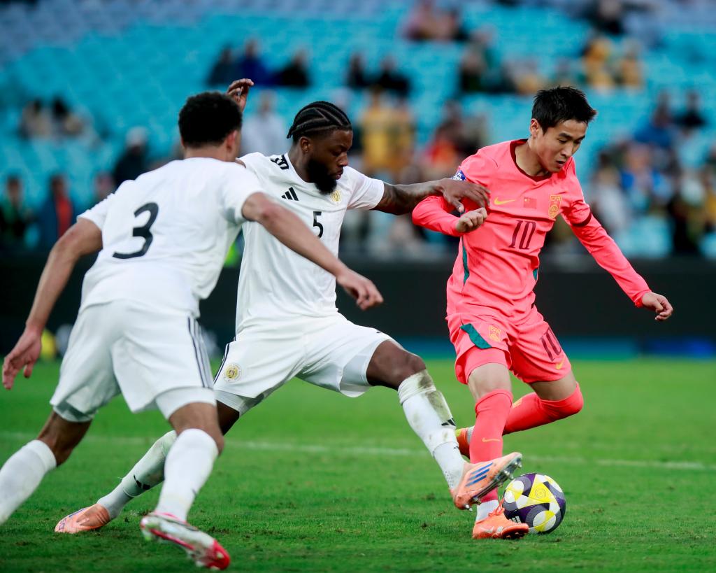 僵局在上半场伤停补时阶段被打破。第47分钟,中国队在由守转攻的过程中打出精妙配合,张玉宁前场头球摆渡送出助攻,韦世豪禁区内冷静施射破门,帮助中国队1:0领先结束上半场。