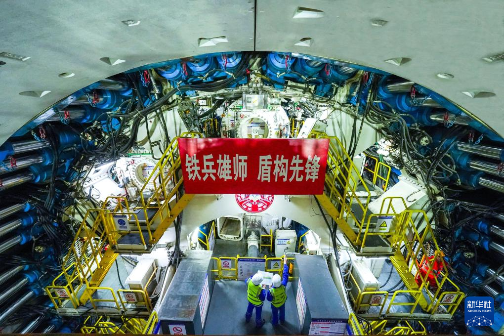 3月30日,中铁十四局项目施工人员对盾构机中心锥进行巡检。新华社发(林凤 摄)
