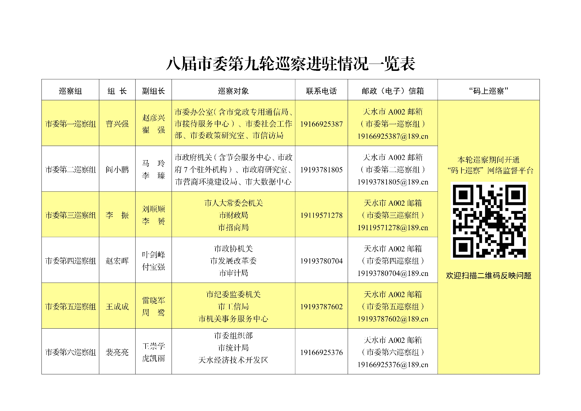 新天水讯【天水融媒记者 辛闻】根据市委统一部署,八届市委第九轮巡察组建6个巡察组,分别对市纪委监委机关、市委办公室、市人大常委会机关、市政府机关、市政协机关、市委组织部、市委社会工作部、市委政策研究室、市发展改革委、市工信局、市财政局、市审计局、市信访局、市统计局、市政府研究室、市营商环境建设局、市招商局、市大数据中心、市机关事务服务中心、天水经济技术开发区20个市直部门(单位)党组织开展常规巡察。截至3月30日,巡察进驻工作全部完成。