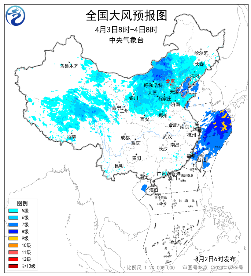 预计,4月3日8时至4日8时,新疆东部、青海大部、西藏北部、内蒙古中西部、甘肃河西和东部、宁夏、陕西北部、山西、河北、北京、天津、山东北部、吉林、辽宁等地部分地区有4~6级风、阵风7~9级,内蒙古中部、山西北部、河北北部、北京西部等地局地阵风可达10级以上;渤海、渤海海峡、东海大部海域、台湾海峡、台湾以东洋面将有7~8级风、阵风9级,其中,渤海、东海北部、台湾海峡部分海域风力可达9级、阵风10级。