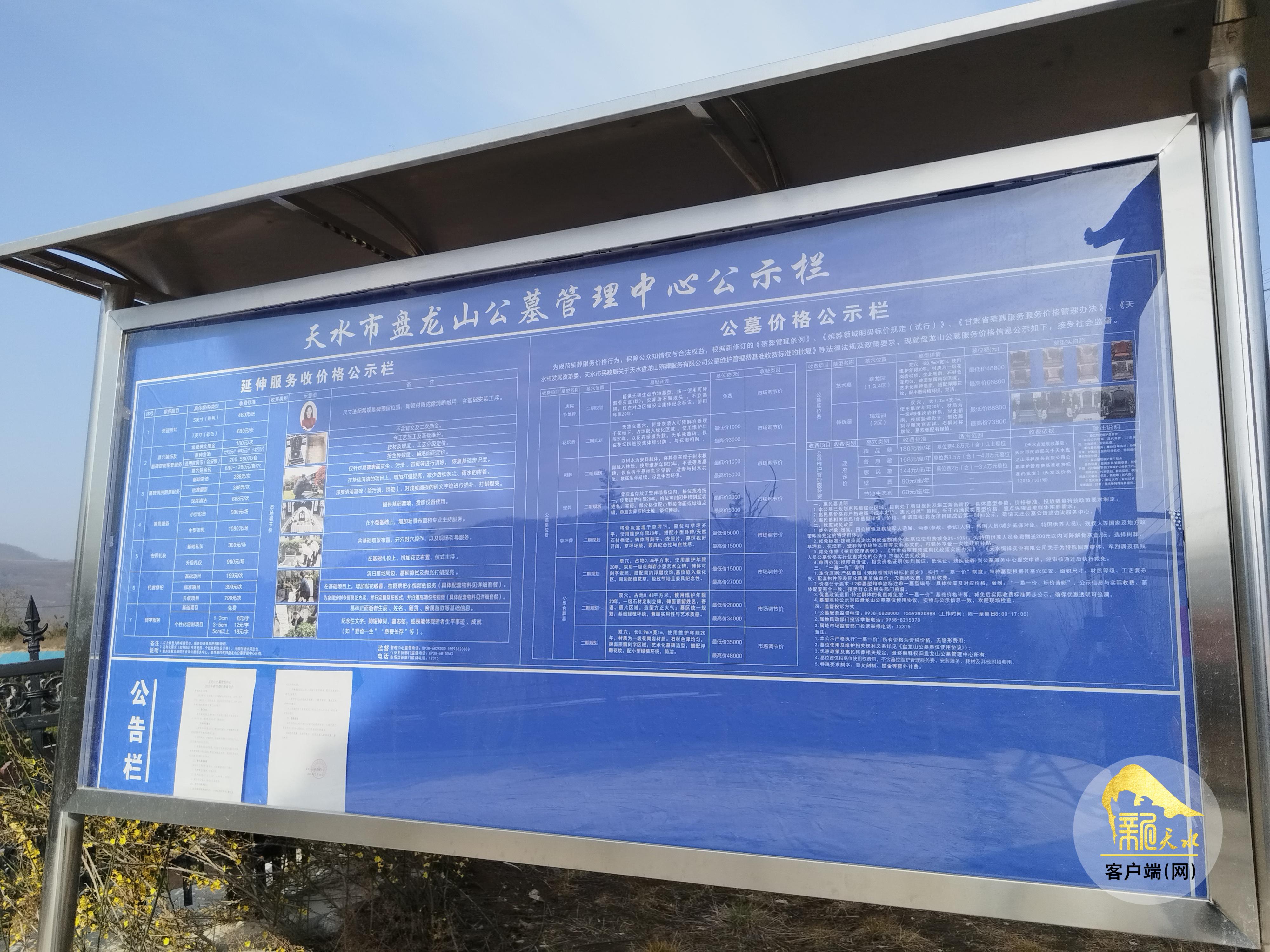 新馆园区环境静谧幽雅,风格简约而庄重。走进天水市殡仪馆综合服务厅,室内宽敞明亮,张贴在墙面上的“以人为本,公益惠民”八个字格外醒目,其旁边设置的殡葬服务价格公示牌以及大厅正中央的电子屏上,对基本服务项目、延伸服务项目等收费标准都有明确公示,一目了然。在天水市盘龙山公墓,记者同样看到了公墓管理中心在墓园出入口处设置了公示栏,将延伸服务收费价格等进行了公示。