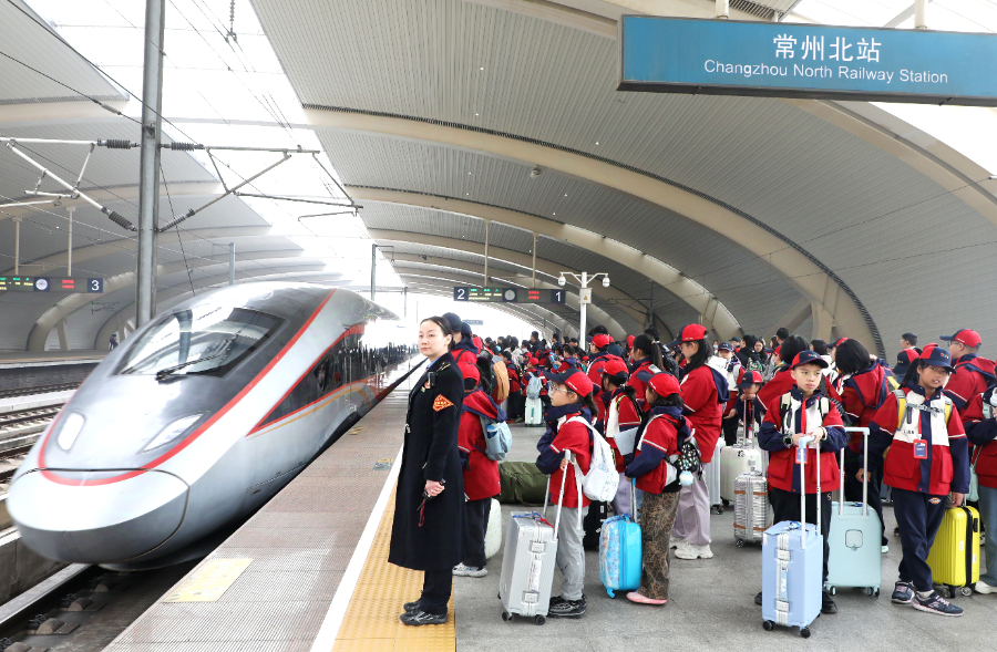 2026年4月1日,学生们在江苏常州北站乘坐高铁外出旅行。新华社发(陈暐摄)