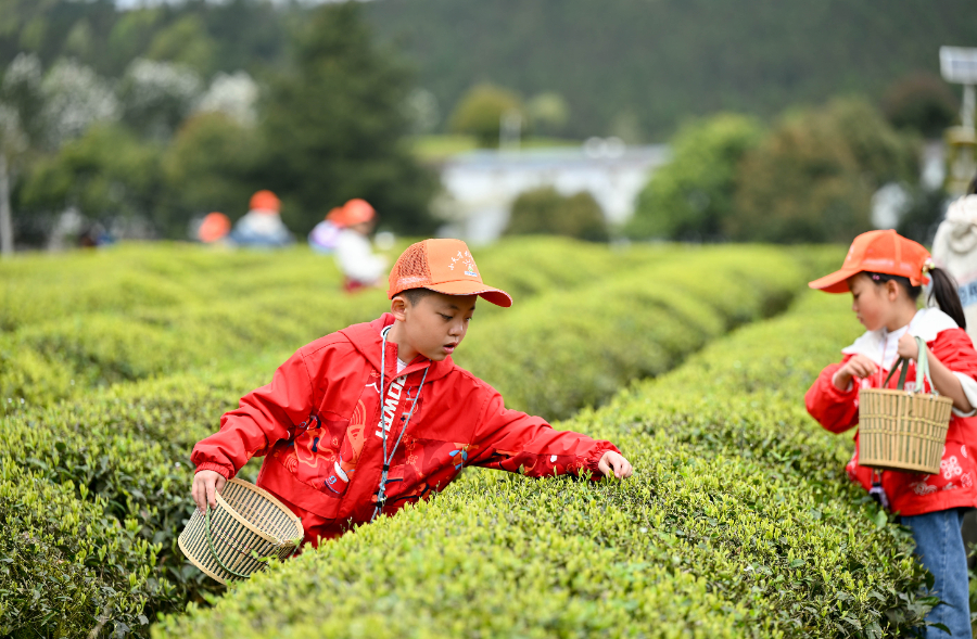 2026年4月1日,小朋友在贵州省贵阳市开阳县龙岗镇坝子村生态茶园体验采摘春茶。新华社发(袁福洪摄)