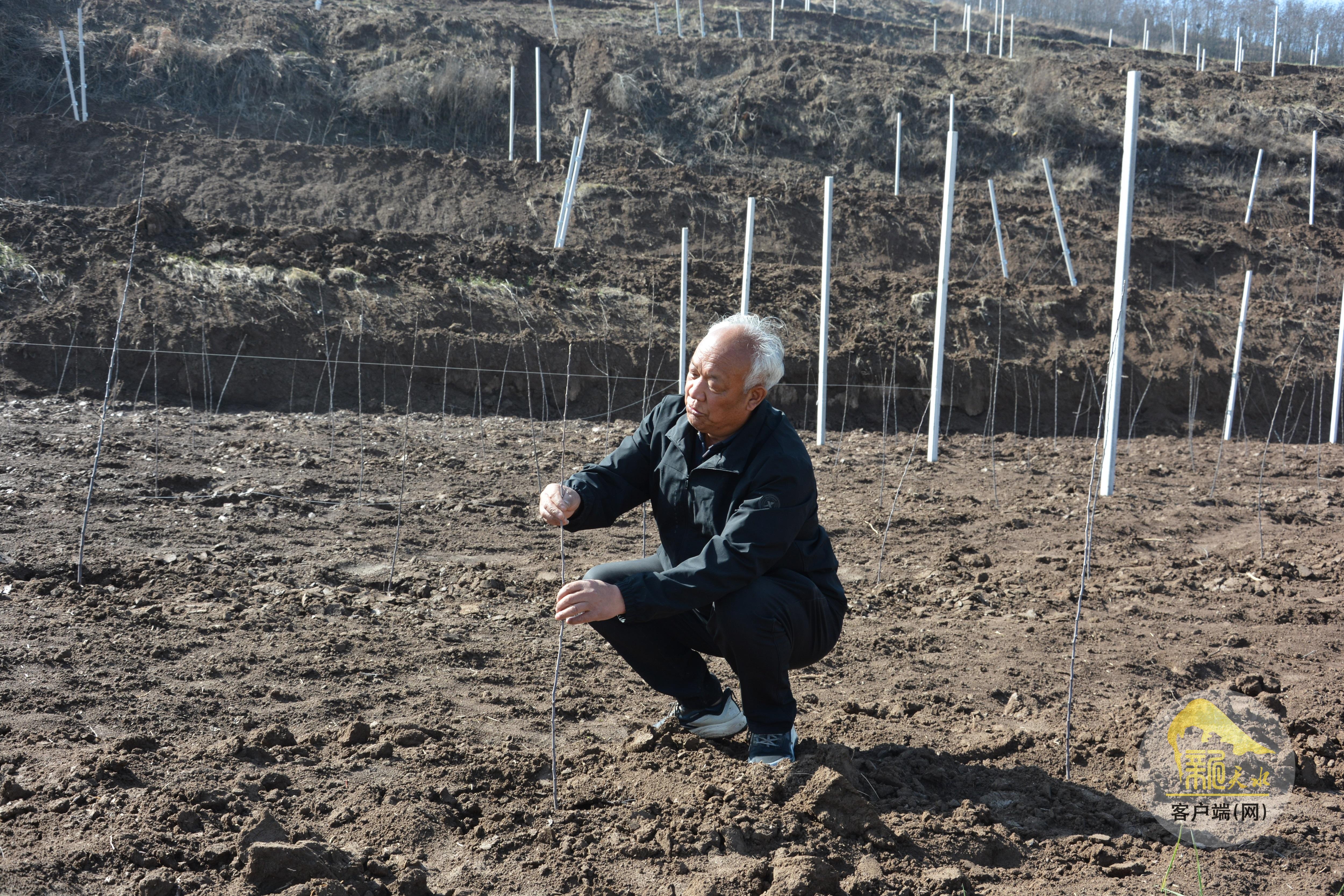 “单株就要促发枝条,枝条长出来拉成水平式,促进叶芽分化成花芽,明年绝对能挂果。”郭保林熟练地介绍着矮化密植苹果的管理技巧,“当年见花,次年见果,三年丰产。这些果苗刚栽植不久,水肥一体、滴灌技术即将同步跟上,管理起来省心,效益也高。”