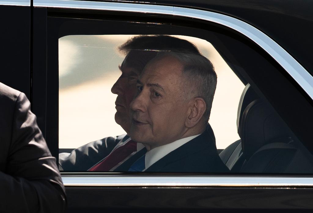 2025年10月13日,在以色列本-古里安机场,以色列总理内塔尼亚胡(前)同到访的美国总统特朗普同乘一辆车。新华社记者陈君清摄