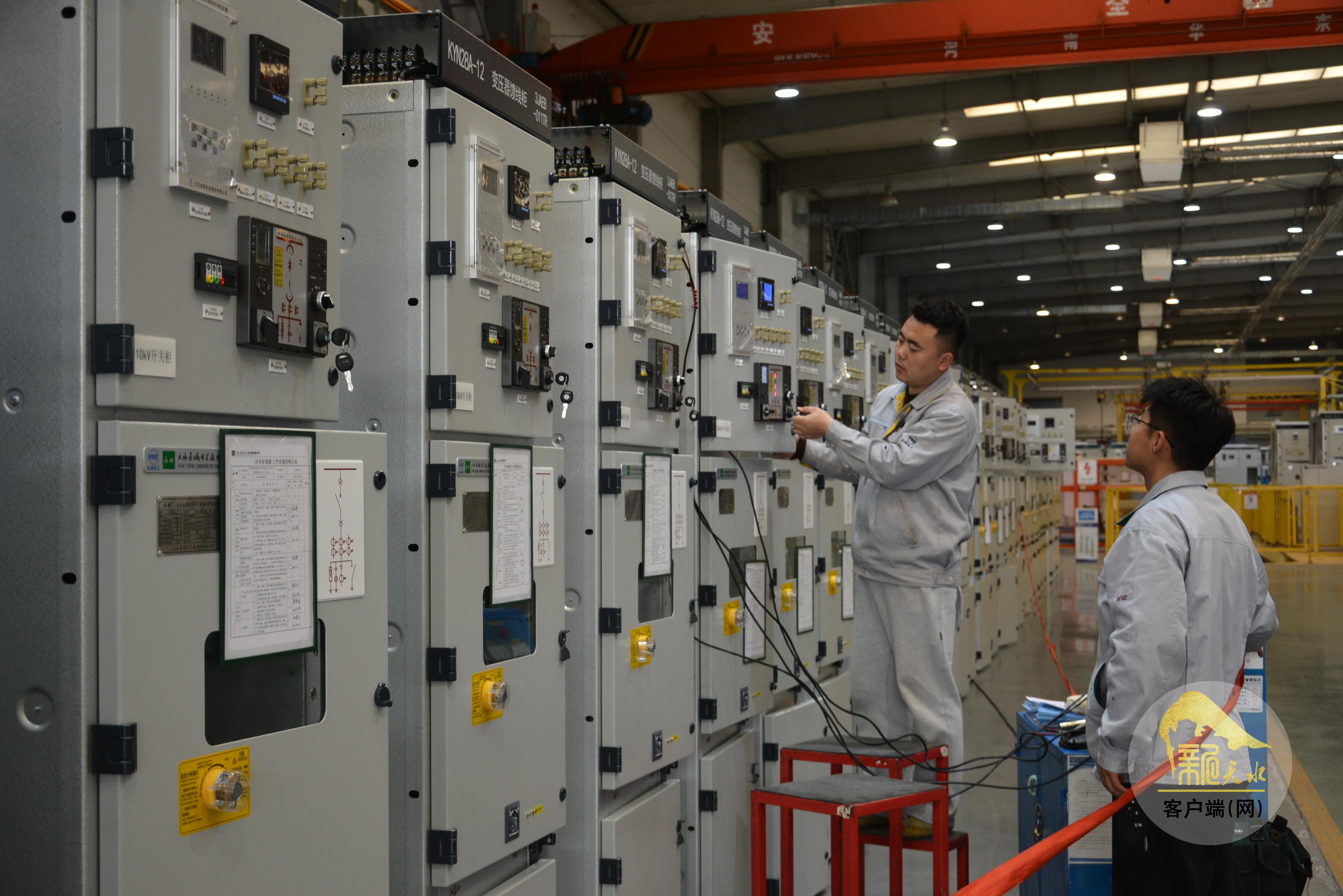 4月9日,在天水长城开关厂集团有限公司中压空气绝缘开关设备数字化车间(AIS)生产现场,员工严把质量关,对即将出厂交付的KYN28A—12型开关柜产品进行调试。