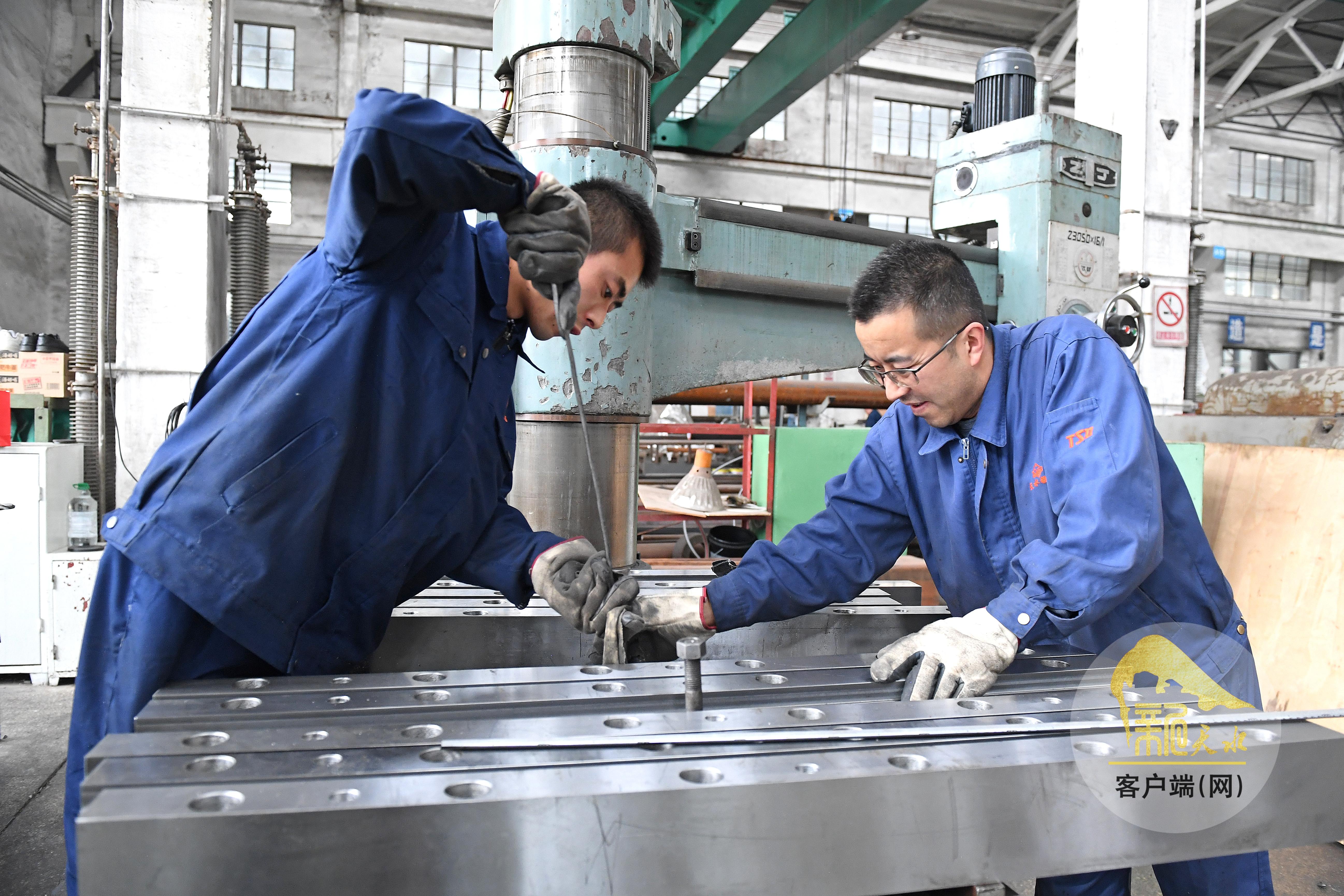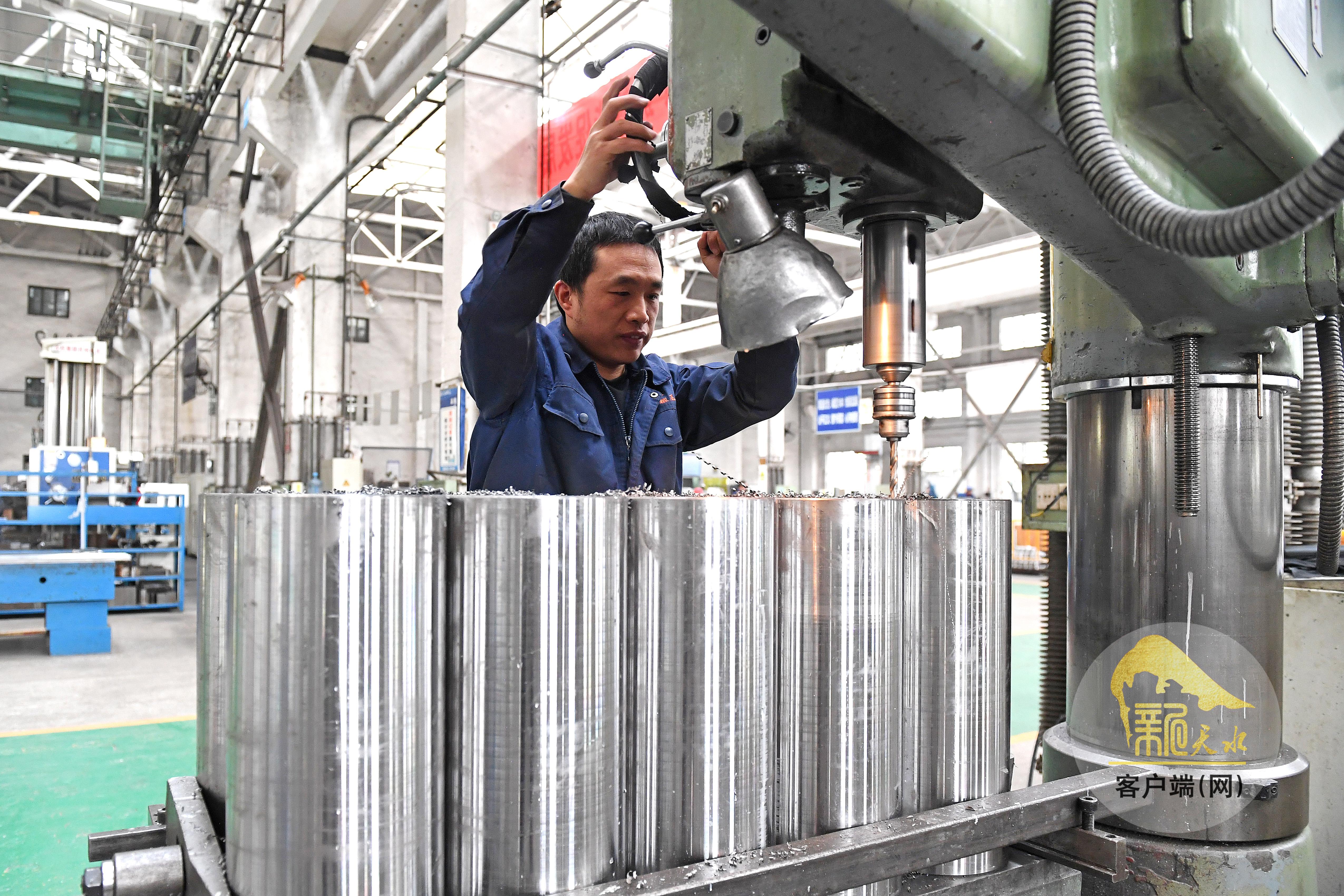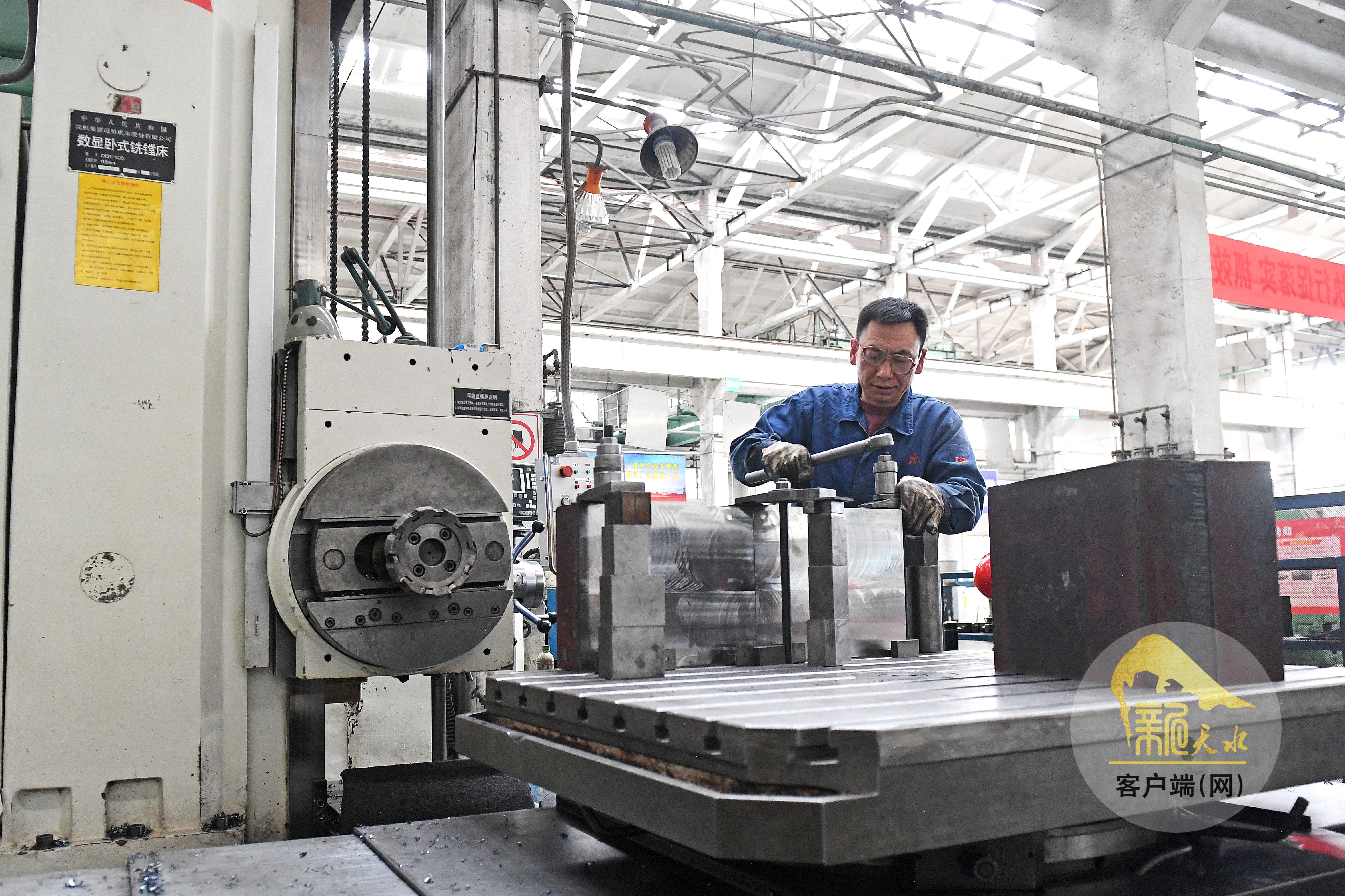 4月13日,天水锻压机床(集团)有限公司的工人在加工产品部件。