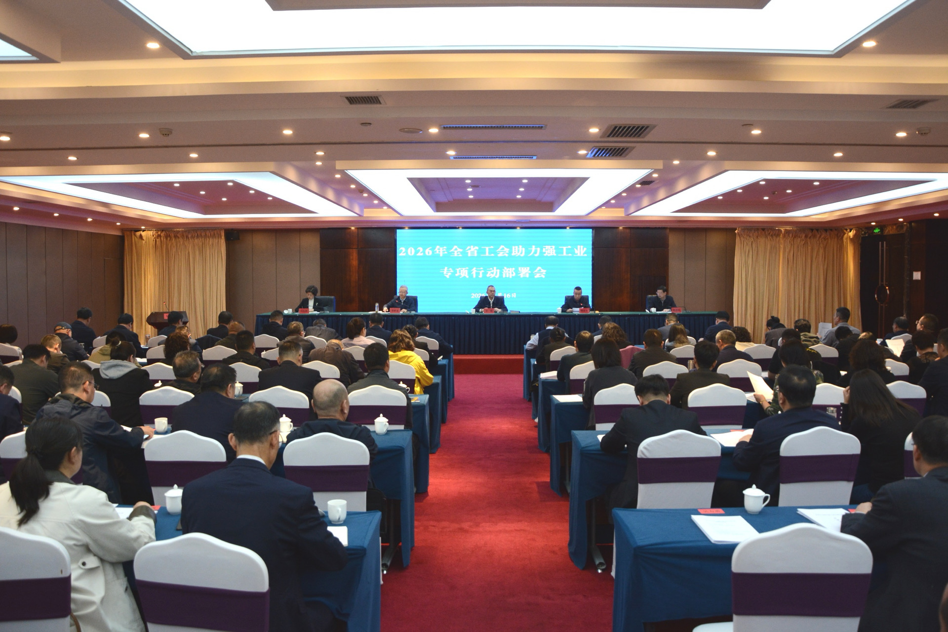 新天水讯【天水融媒记者 李欣桐】4月16日,2026年全省工会助力强工业专项行动部署会在天水召开。省总工会党组书记、常务副主席李毅,省工信厅党组成员、副厅长陶英平,市人大常委会副主任、市总工会主席张思佳,副市长汪小娟出席会议。省总工会党组成员、副主席罗世文主持会议。