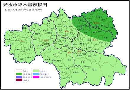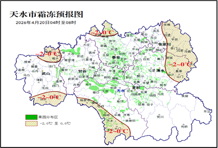 受冷空气影响,19至20日全市大部最低气温下降6~8℃,最低气温出现在20日清晨,城区最低气温为2~5℃,其中秦州区西部和南部、武山县南部和东北部、秦安县西北部、张家川县中东部及清水县东部高海拔山区可降至-2~0℃,有轻霜冻。