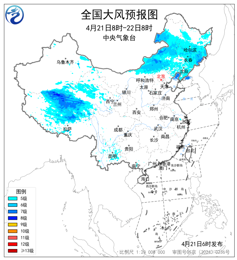 大风蓝色预警:预计,4月21日8时至22日8时,内蒙古中东部、黑龙江中南部、吉林、辽宁以及新疆南疆盆地、西藏北部、青海西部等地部分地区有5~7级风,阵风8~9级,渤海北部海域、黄海北部海域将有7级、阵风8级的风。