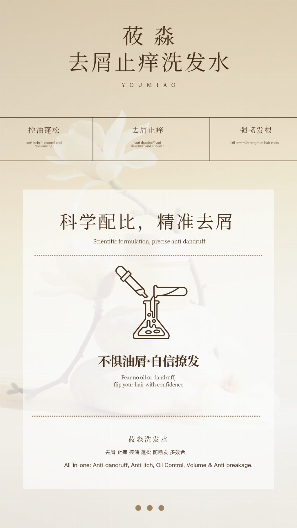 莜淼洗发水以强效去屑为核心亮点,搭配多重专利技术与高活性植萃成分,按功效科学复配,构建完整高效的头皮护理体系,成分鲜明直观、数据真实可感、效果循序渐进:
