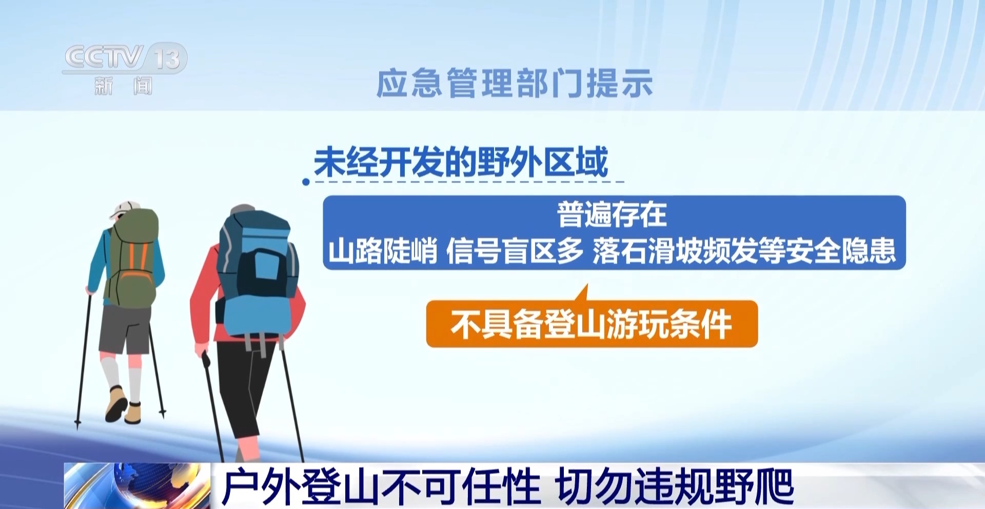 应急管理部门提示,未经开发的野外区域,普遍存在山路陡峭、信号盲区多、落石滑坡频发等安全隐患,不具备登山游玩条件。违规野爬不仅极易造成个人伤害,一旦有人员遇险还会耗费大量公共资源。擅自进入自然保护区等违法行为,还将依法承担相应责任。