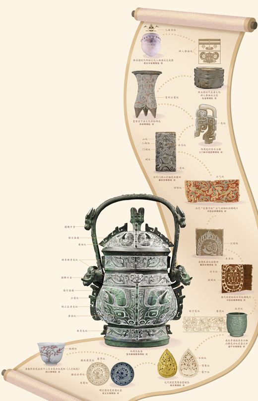 记者在展览中看到,中国传统纹样大致可分为几何纹、动物纹、植物纹、人物纹、器物纹等类别,本文选取云雷纹、兽面纹、莲花纹3种纹样,观察其演变过程。