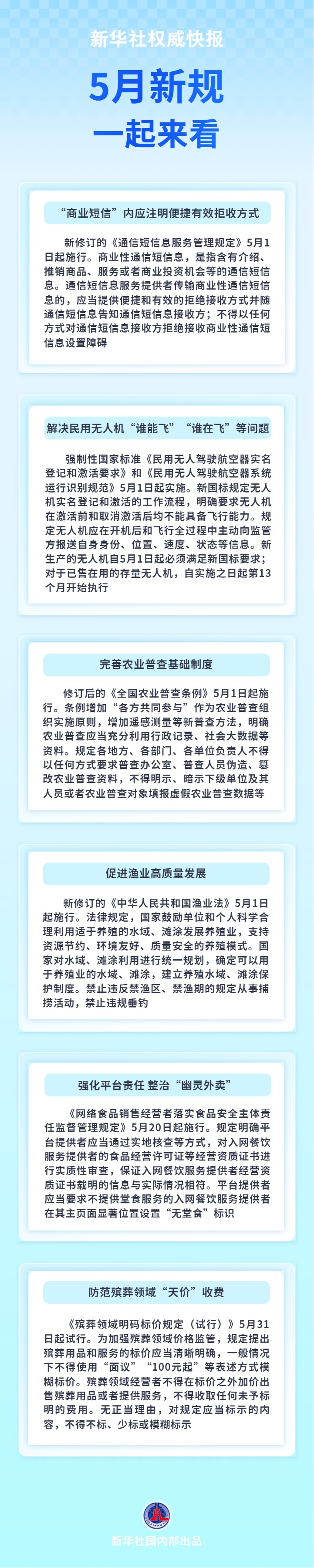 规定“商业短信”内应注明便捷有效拒收方式;解决民用无人机“谁能飞”和“谁在飞”等问题;完善农业普查基础制度……5月新规,一起来看。