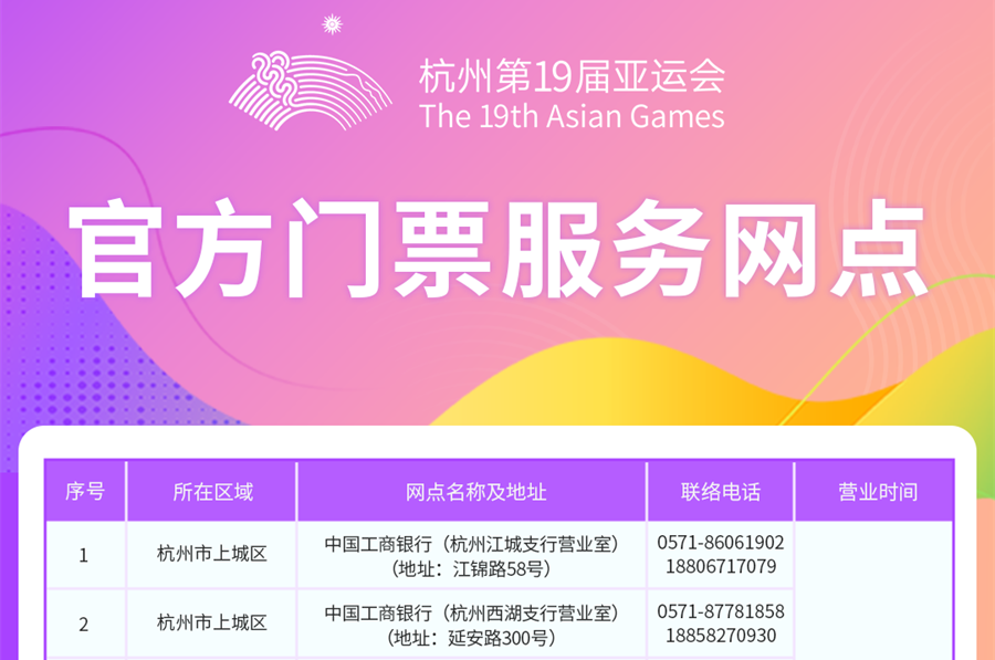 杭州第19届亚运会体育比赛门票官方线下购票渠道8月23日陆续对社会开放
