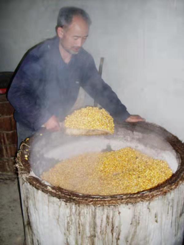 酒曲有了,下来蒸料。王贯儿搅拌按比例混合的玉米和小麦,用甑锅(俗称净锅)蒸熟,玉米必须蒸烂,酒曲方可从裂口入味。蒸好,出锅。