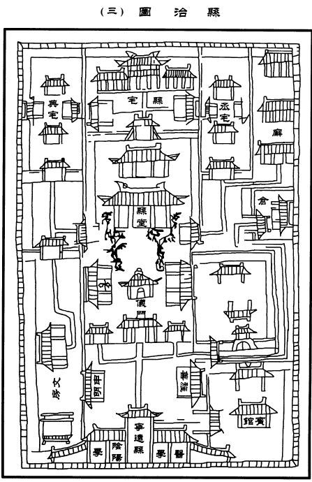 万历《宁远县志》,邹浩纂,明万历十五年(公元1587年)稿本。凡9卷32目。其卷一《图象》附有县境图、县城图、县治图、庙学图。其中“县治图”以实录的方法,线刻县衙及其他官署平面图,单体建筑几楹、街巷若何等都清清楚楚,甚至县堂前的两棵树都标出来了。此外,主要建筑还标示名称。以县堂为中心,前为仪门,再前为旌善、申明二亭,再前为县署大门和医学、阴阳学;后为县宅。县堂东一路从后往前有丞宅、廨、仓、宾馆,县堂西一路从后往前有典宅、文房等。