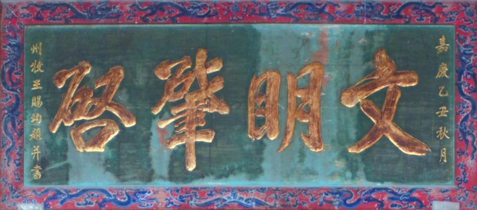 天水伏羲庙先天殿内正中神龛上方悬挂“文明肇启”匾额,为清嘉庆十年(1805年)九月,秦州知州王赐均所题。充分肯定了伏羲的功绩,赞颂伏羲爷开创了人类进入文明的新时代。