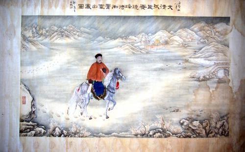 安维峻去张家口时正值严冬腊月,《大清孤臣安晓峰出塞图》一画中,占据较大尺幅的是积雪皑皑、朔风凛凛,人物四周都是积满了冰雪的山峦。画中的安维峻穿着厚重的皮毛褂,身跨青骢马,在漫漫征途上踏出了一串串马蹄印,曲曲折折由远到近延伸过来。青骢马在雪地里迈步行走,没有奔跑。安维峻据鞍远眺,仿佛看见谪居之处——张家口,城垣历历在目,但可望而不可即,表现出他在征途中忧国愤慨的心情,但也描绘出他昂首向前的大无畏精神。