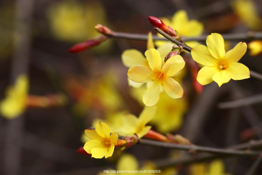 迎春花首先跳出了春天的调色盒,轻盈地迸溅到角角落落,开启了春天的色彩之旅。迎春花的黄,醒目明亮,晶莹璀璨,仿佛一双双机灵的眼睛在眨巴着。一朵朵,一簇簇,一片片,迎春花开起来蓬蓬勃勃。这种花生命力顽强,即使在贫瘠的角落里,也会灿然绽放,只为把春天的色彩点亮。迎春花算不上漂亮,但它有灵动的气质。它传递着季节的消息,是春天的一个生动的眼神。迎春花一开,万物都跟着醒来。“迎得春来非自足,百花千卉共芬芳。”迎春花是美丽的引领者,引领百花次第开起来。