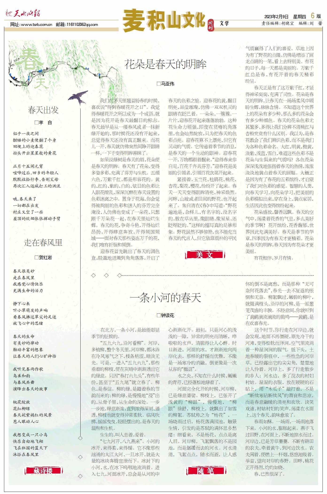 如果说绿树是春天的眉,花朵便是春天的明眸。春天有了花朵,变得多姿多彩,充满了芬芳与生机。五颜六色,万紫千红,都是形容花的。黄的、红的、紫的、白的,炫目的色彩让人眼花缭乱,深深沉醉在春天设置的色彩迷离之中。置身于花海,你会觉得被绚丽的色彩和迷人的芬芳完全淹没,人仿佛也变成了一朵花,只想跟千万朵花一起,在春天里灿烂生辉。春天的花,争奇斗艳,开得灿烂昂扬,开得肆意奔放,开得倾国倾城——面对春天那些姿态万千的花,我们唯有折服和倾倒。